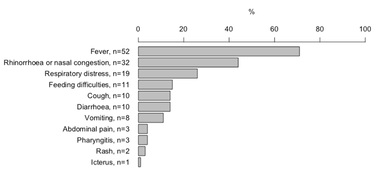 Overall, the most common symptom reported was fever, in 52 (71%), followed by rhinorrhoea or nasal congestion in 32 (44%) and respiratory distress in 19 (26%) (fig. 1). Further symptoms included feeding difficulties in 11 (15%), cough in 10 (14%), diarrhoea in 10 (14%), vomiting in 8 (11%), abdominal pain in 3 (4%), pharyngitis in 3 (4%), rash in 2 (3%) and jaundice in 1 (1 %) neonate.