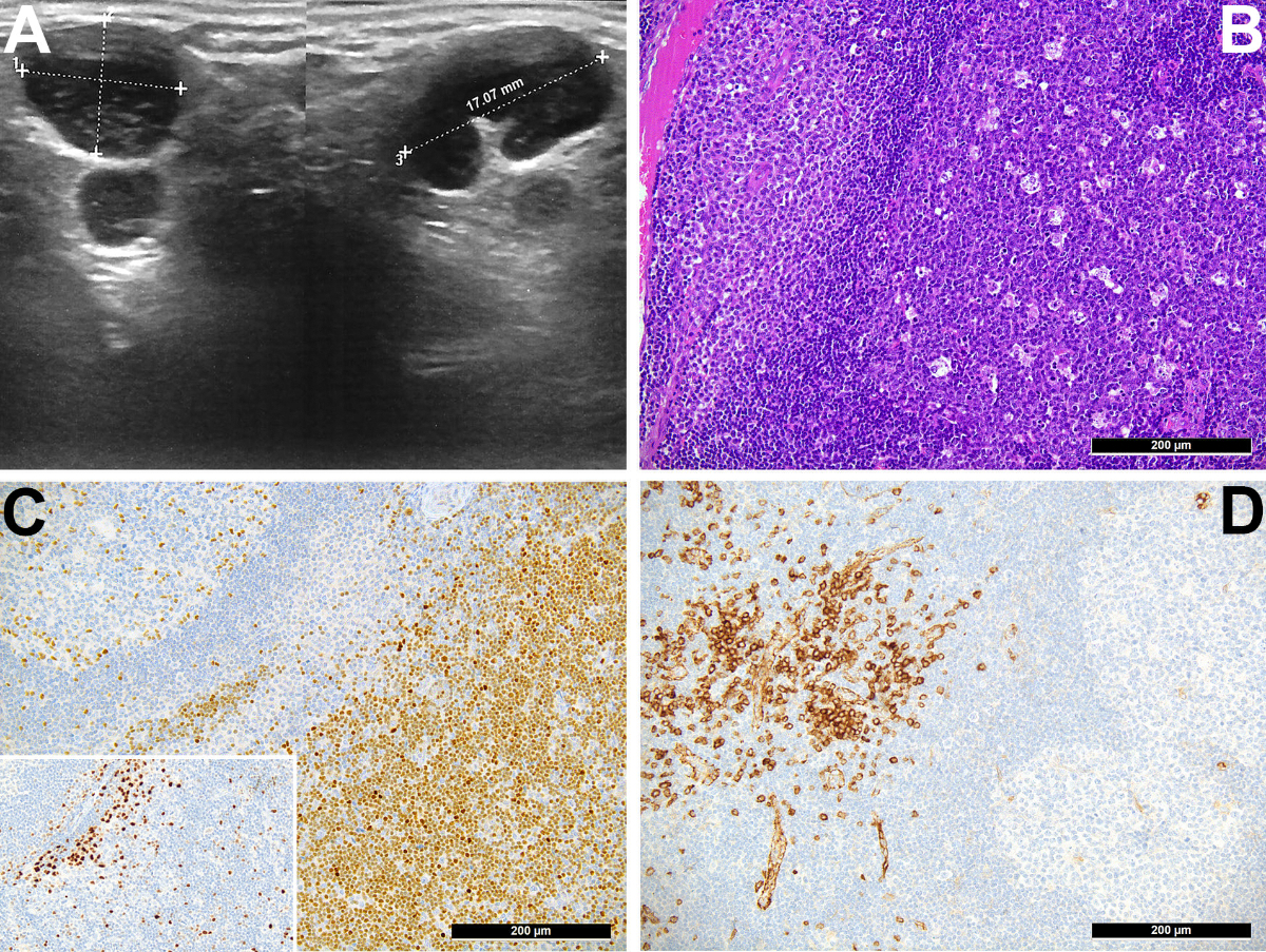 Ultrasonography revealed large supraclavicular lymh nodes, one 17 × 13 × 10 mm (fig. 1A). A contrast-enhanced computed tomography (CT) scan confirmed enlarged axillar and supraclavicular lymphadenopathies. Smear from a fine needle aspiration revealed a florid reactive lymphadenopathy pattern with tingible body macrophages and lymphocytes at different stages of maturation.