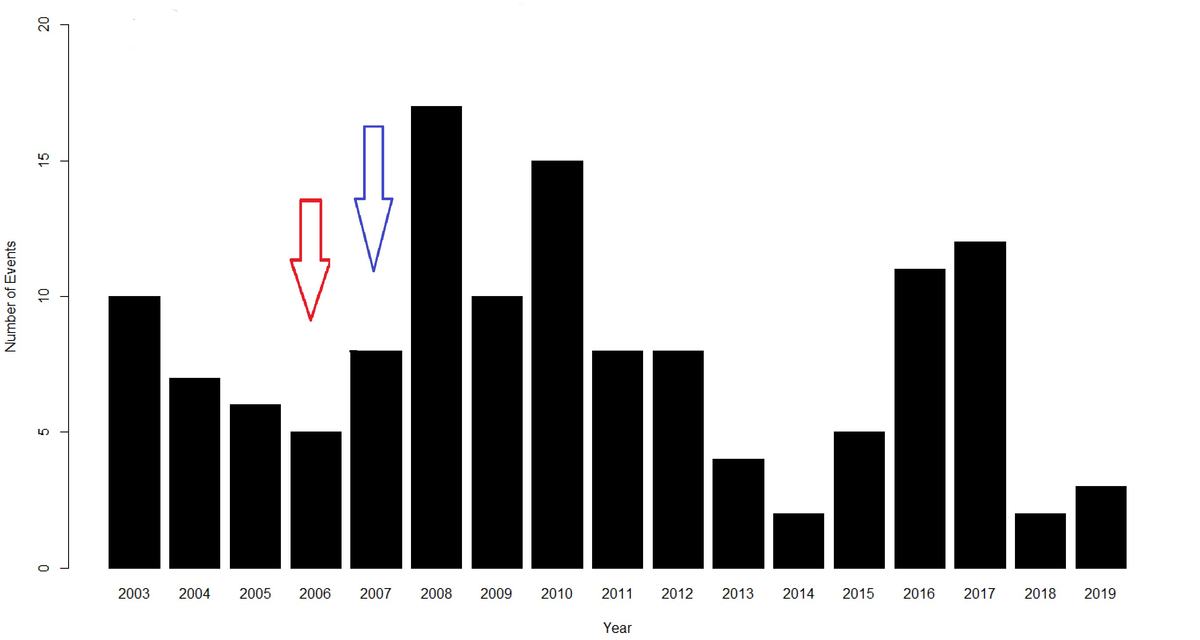Figure 2 shows the number of events, ranging from 2 to 17, by year.