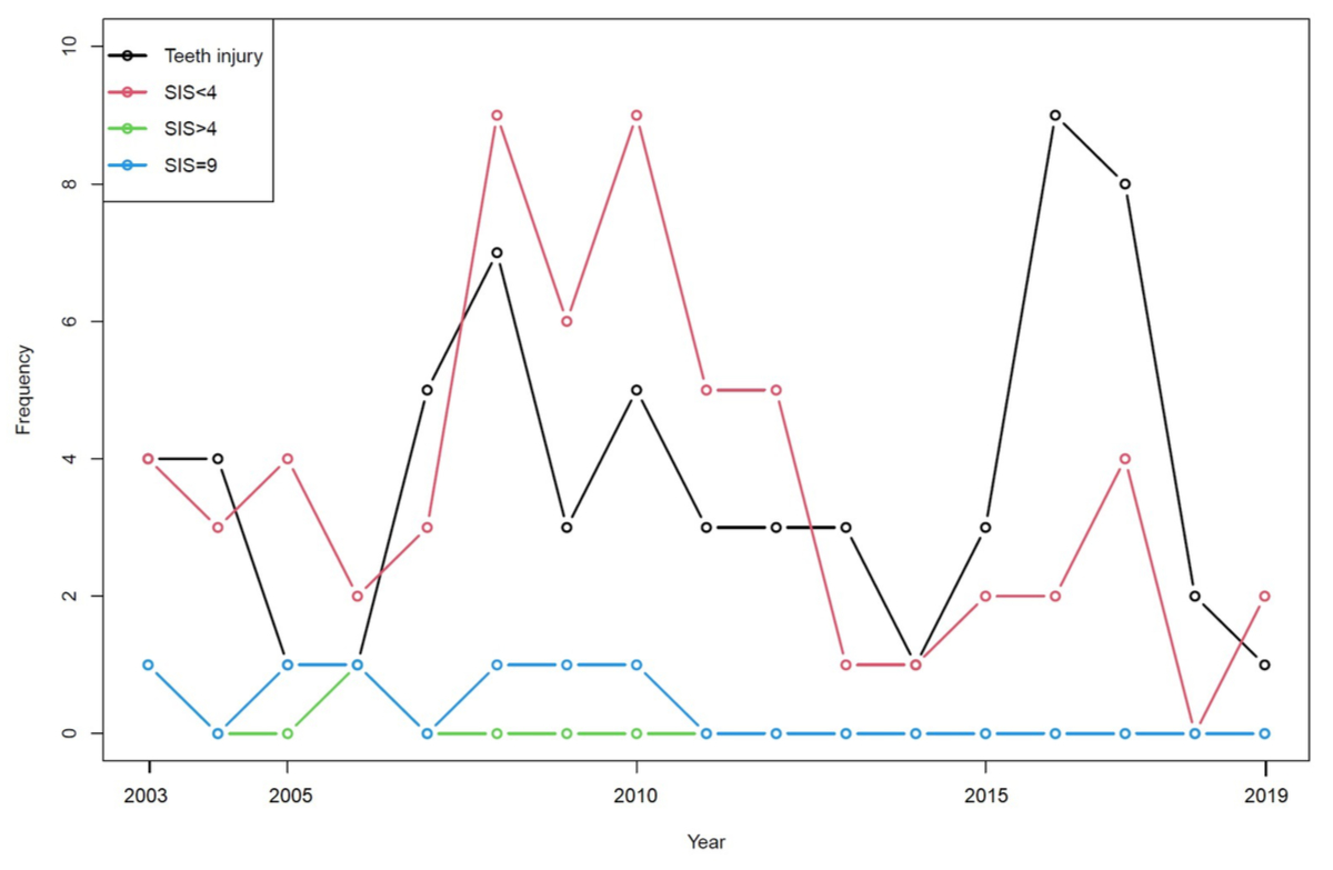 Figure 3 Temporal trends of anaesthesia-related complications SIS <4 (red dotted line), SIS >4 (green dotted line), SIS = 9 (blue dotted line) and tooth injuries (black dotted line) from 2003 to 2019. Number of events by year (n = 133). Each dot represents one year.