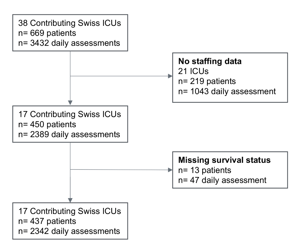 During the first COVID-19 pandemic wave occurring between March 1 and May 31, 2020 in Switzerland, 38 Swiss ICUs collected data from 669 patients representing a total of 3,432 daily assessments (figure 1). Among them, 17 ICUs recorded critical care staffing information and 450 patients with 2,389 daily assessments were eligible for analysis. After the exclusion of 13 (2.9%) patients with missing survival status and their 47 (2.0%) daily assessments, the study population included 17 ICUs, 437 patients and 2,342 daily assessments (figure 1).