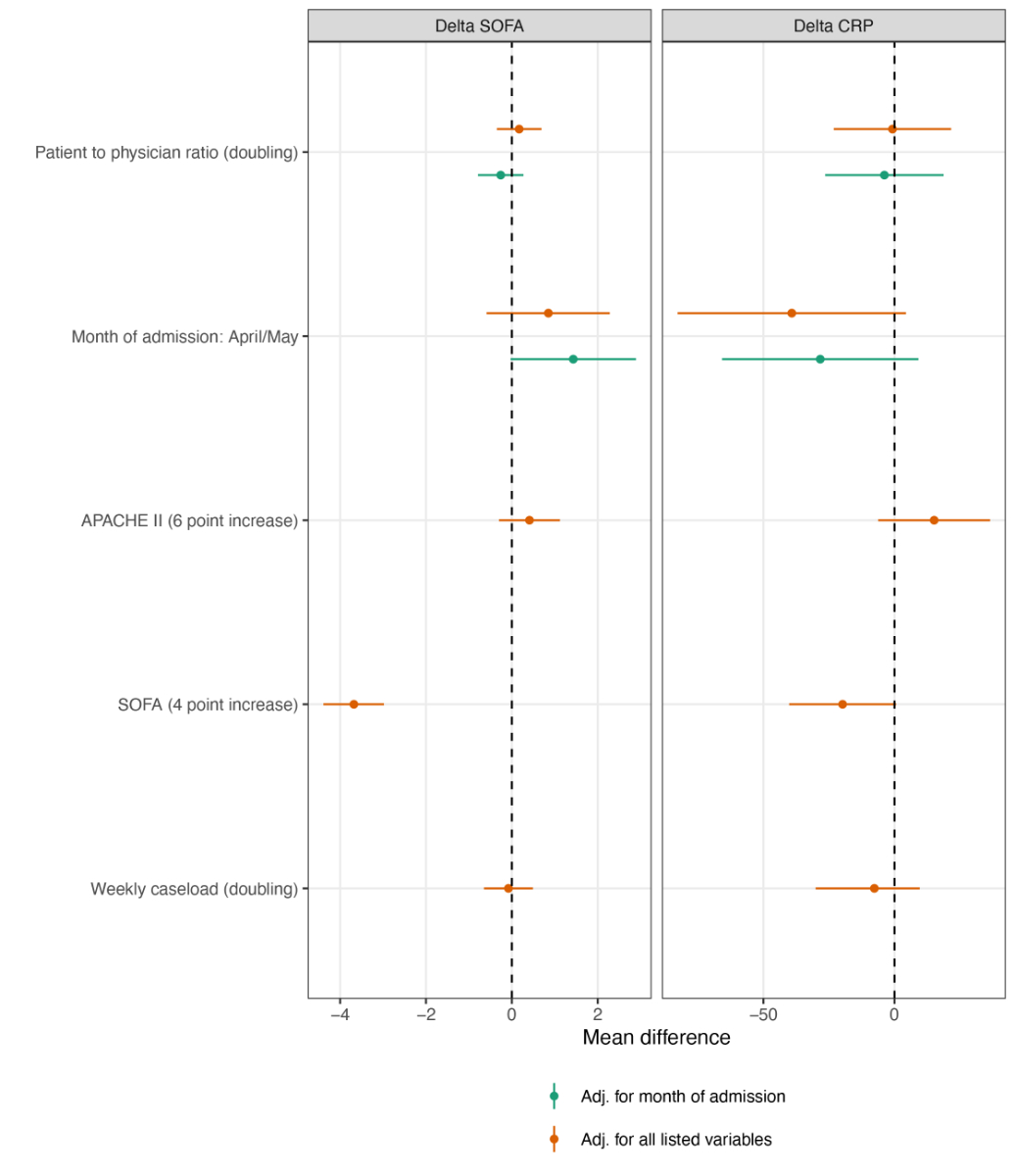Figure 6 Patient-to-physician ratio and delta SOFA, delta CRP.