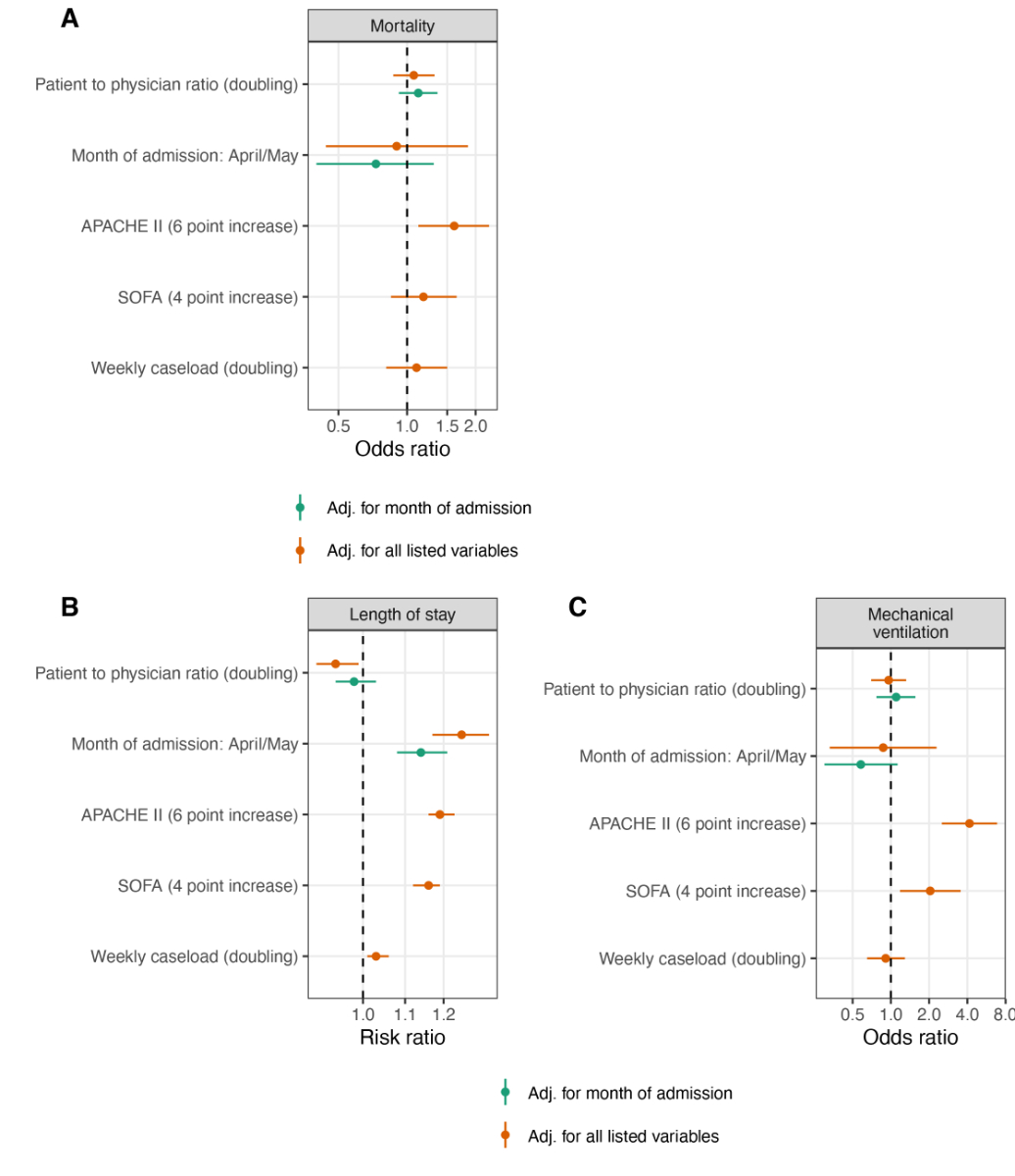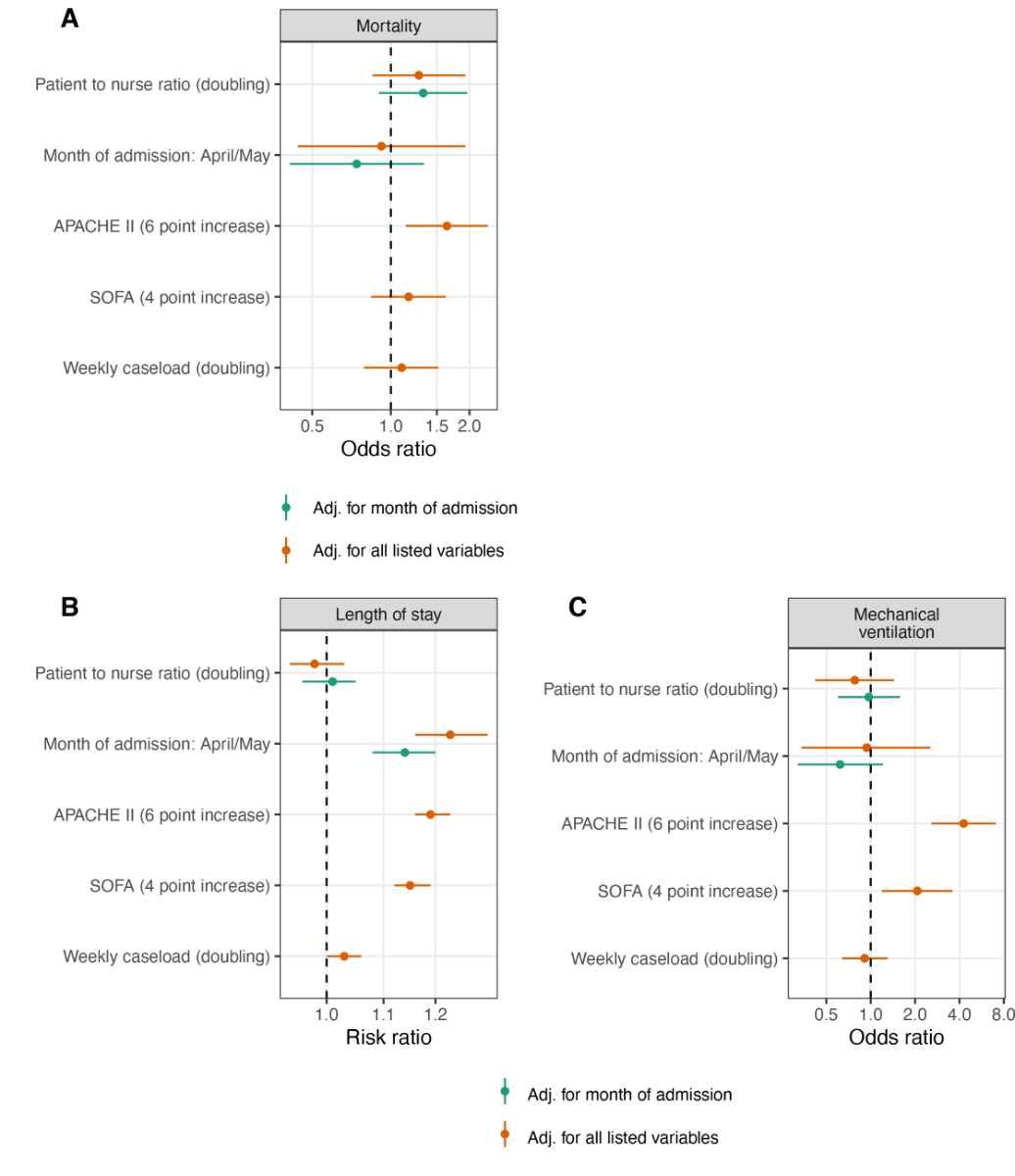 We a priori used the following confounding variables: month of ICU admission (March vs April/May), APACHE II and SOFA severity scores, as well as weekly caseload either time adjusted (adjusting for only month of ICU admission) or fully adjusted (adjusting for all mentioned variables). The ‘patient-to-critical care staffing’ ratio and the weekly caseload was modelled as a linear continuous logarithm-transformed (with respect to basis 2) variable, i.e. the effect on study outcomes is expressed in the doubling of the patient to critical care staffing ratio or the weekly caseload. We used complete case analysis because of a fraction of missing patients and daily assessments smaller than 3% [21]. We analysed the data using the statistical software R Version 3.6.3.