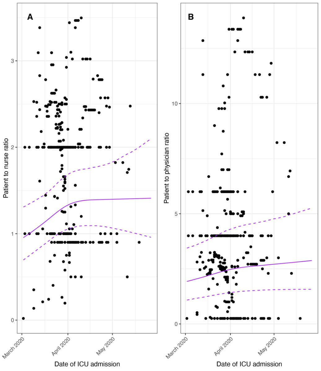 On March 17, 2020 the prospective observational Risk Stratification in COVID-19 patients in the ICU (RISC-19-ICU) registry was launched to capture COVID-19 features and track characteristics and outcome of patients with SARS-CoV-2 infections admitted to ICUs. The registry (ClinicalTrials.gov Identifier: NCT04357275) has been endorsed by the Swiss Society of Intensive Care Medicine (https://www.sgi-ssmi.ch) and was exempt from the need for additional ethics approval and patient informed consent by the ethics committee of the University of Zurich (KEK 2020-00322) [1]. Informed consent for publication was approved by the Ethics committee (KEK 2020-00322, KEK 2020-00375). Collaborating centres have complied with all local legal and ethical requirements. The study complies with the Declaration of Helsinki, the Guidelines on Good Clinical Practice (GCP-Directive) issued by the European Medicines Agency, as well as the Swiss law and Swiss regulatory authority requirements. The registry has been designed in accordance with the Strengthening the Reporting of Observational Studies in Epidemiology (STROBE) guidelines for observational studies [28]. Eligibility criteria have been described elsewhere [1, 20]. The current retrospective analysis on the RISC-19-ICU registry (KEK 2020-00375) incorporated an extended dataset consisting of daily patient-to-nurse and patient-to-physician ratios. The analysis has been restricted to the period from March 1, 2020 to May 31, 2020, and to participating ICUs across Switzerland. Due to resource limitations, it was not possible to prospectively obtain comprehensive data on critical care staffing beyond this time window. Data on critical care staffing from March 1 to March 17, 2020 was collected retrospectively.