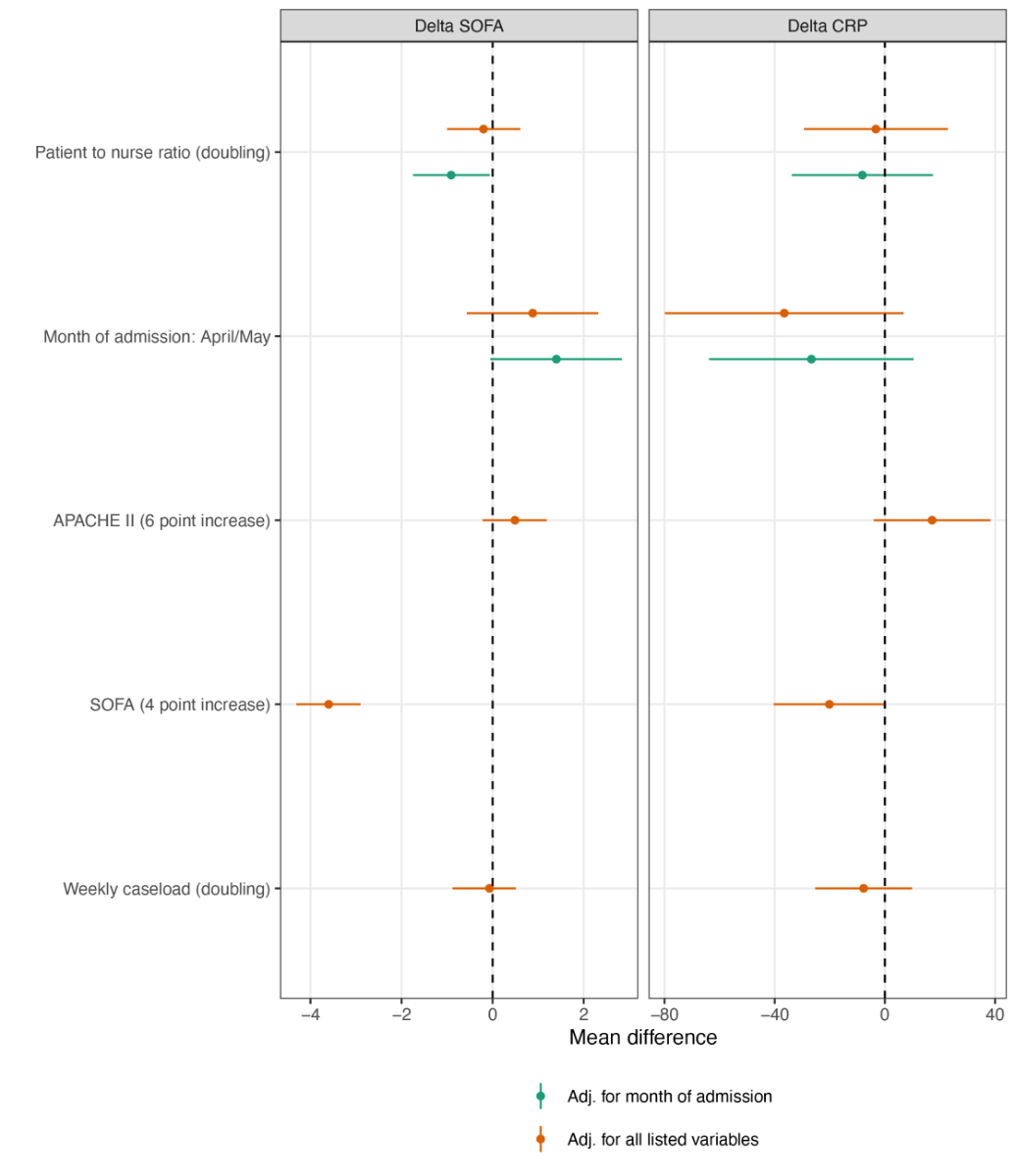 Figure 4 Patient-to-nurse ratio and delta SOFA, delta CRP.