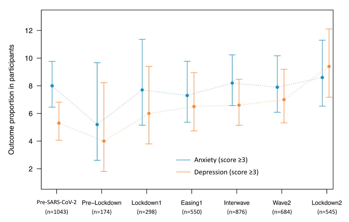 Figure 3 Proportion of participants (with 95% CIs) who screened positive for anxiety or depression over the different SARS-CoV-2 prevention periods. A positive screening was defined as a score of 3 or greater on the relevant Patient Health Questionnaire-4 (PHQ-4) subscale. The McNemar test was used to compare outcome proportions between periods (two-sided test).