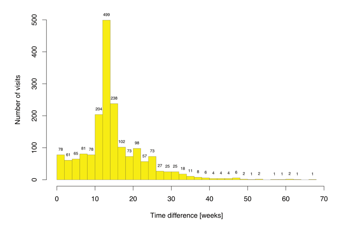 Figure 4 Histogram showing the lengths of time (in weeks) between follow-up visits occurring during the SARS-CoV-2 pandemic in daily PrEP users who started PrEP before Jan 1, 2020 (n = 534 PrEP users).