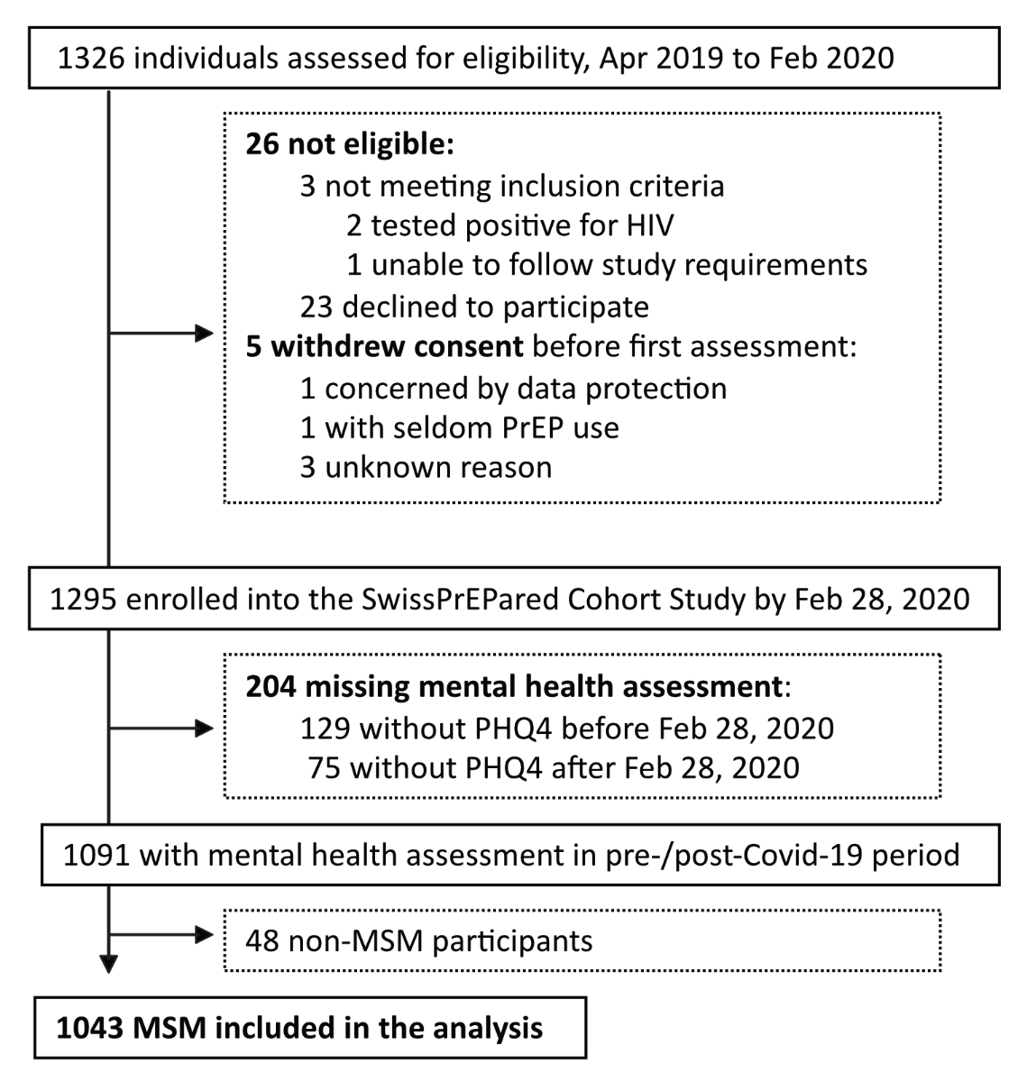Data were collected from 14 participating centres between April 10, 2019 and March 22, 2021. Overall, 1,326 participants were assessed for eligibility (figure 1). Of these, 26 participants were found to be ineligible (two tested positive for HIV, one was unable to follow the study requirements and 23 declined study participation), whilst five withdrew their consent before the first visit (one concerned by data protection, one with infrequent PrEP use, three for unknown reasons). Thus, 1,295 participants were enrolled in the SwissPrEPared study by February 28, 2020. Of these, 252 were further excluded, either due to a lack of mental health data (129 with missing questionnaire before February 28, 2020 and 75 with missing questionnaire after this date), or because they did not identify as MSM (n = 48). Thus, data from 1,043 participants were eventually included in the analysis.