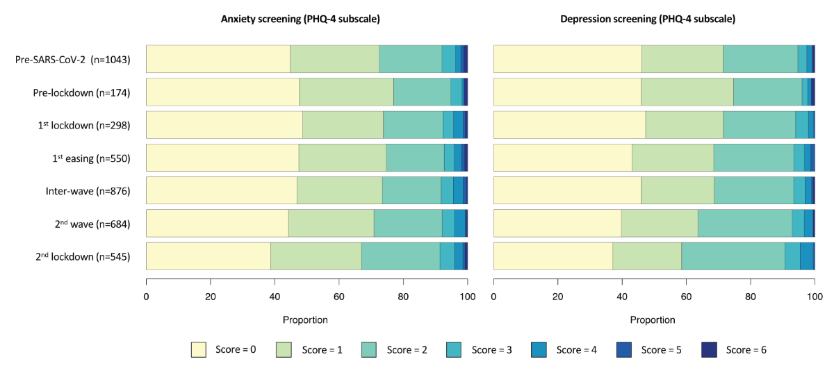 On the PHQ-4 anxiety and depression subscales, most participants scored 0, 1 or 2 (figure 2, pre-SARS-CoV-2 period). When considered as a binary endpoint (score ≥ 3 on each subscale), 8% (83/1043) and 5.3% (55/1043) of the participants screened positive at baseline for anxiety and depression respectively.
