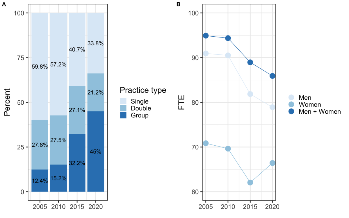 Figure 1 A: Proportion of practice types 2005–2020. B: Mean full-time equivalents (FTE) in men, women and both since 2005.