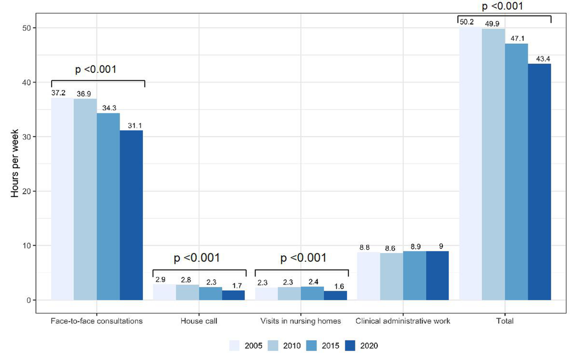 GPs’ time spent on face-to-face consultations with patients gradually decreased from 37.2 hours per week in 2005 to 31.1 hours per week in 2020 (p <0.001). The workload in terms of home visits also decreased over time (2.9 hours per week in 2005 vs. 1.7 in 2020, p <0.001). GPs’ clinical activities in nursing homes were stable from 2005 to 2015 and dropped to some extent in 2020 (2.3 hours per week in 2005 vs. 1.6 in 2020, p <0.001). The workload for clinical administrative tasks nearly remained stable over the years (9 hours per week). Details are shown in figure 2. In 2020, GPs spent 79.0% of their working time in direct patient contact (consultations, house calls or nursing home visits) and 21.0% on clinical administrative work on average.