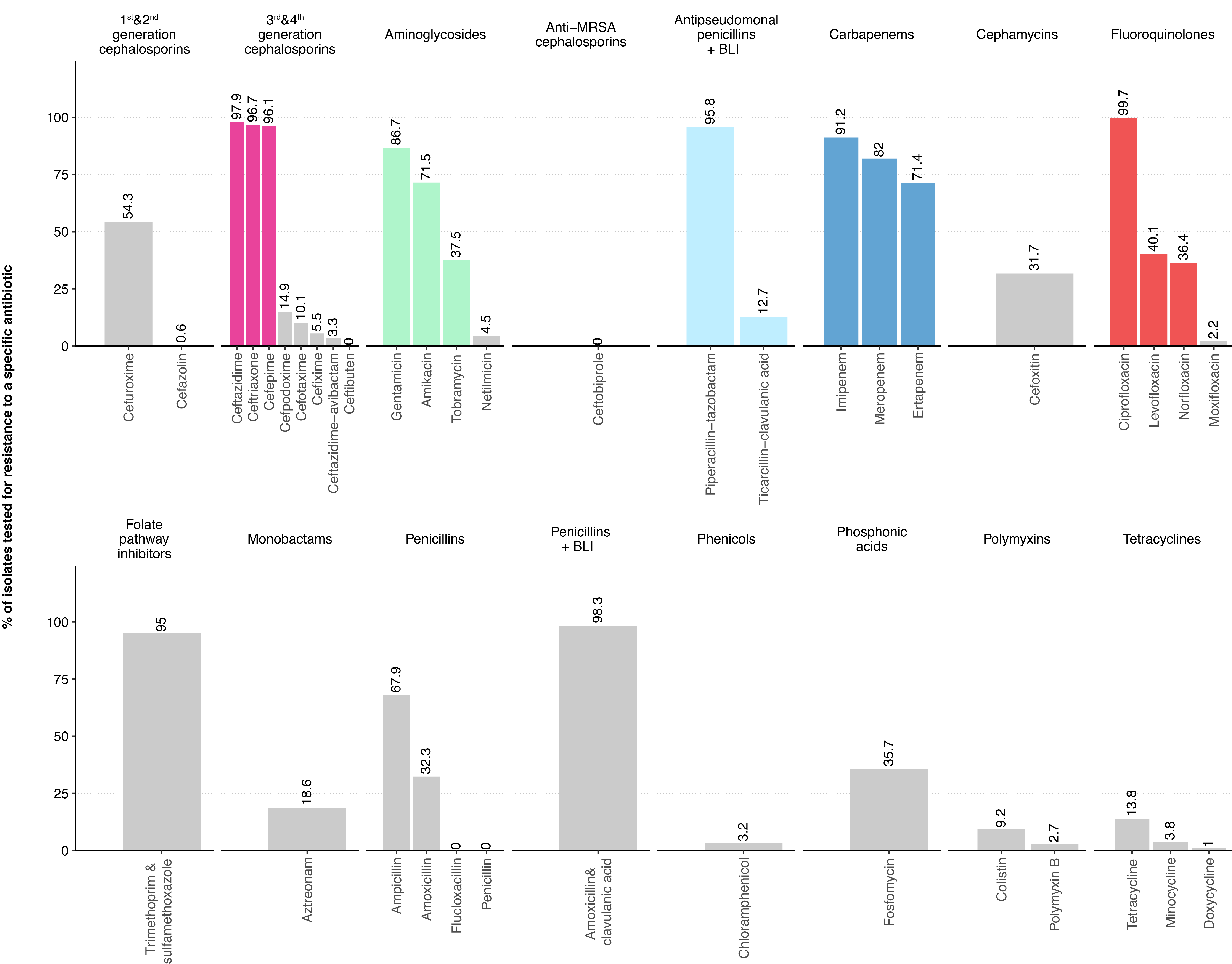 Figure 1 Proportion of Enterobacterales blood culture isolates tested for specific antibiotics among the antibiotic categories defined by the ECDC.