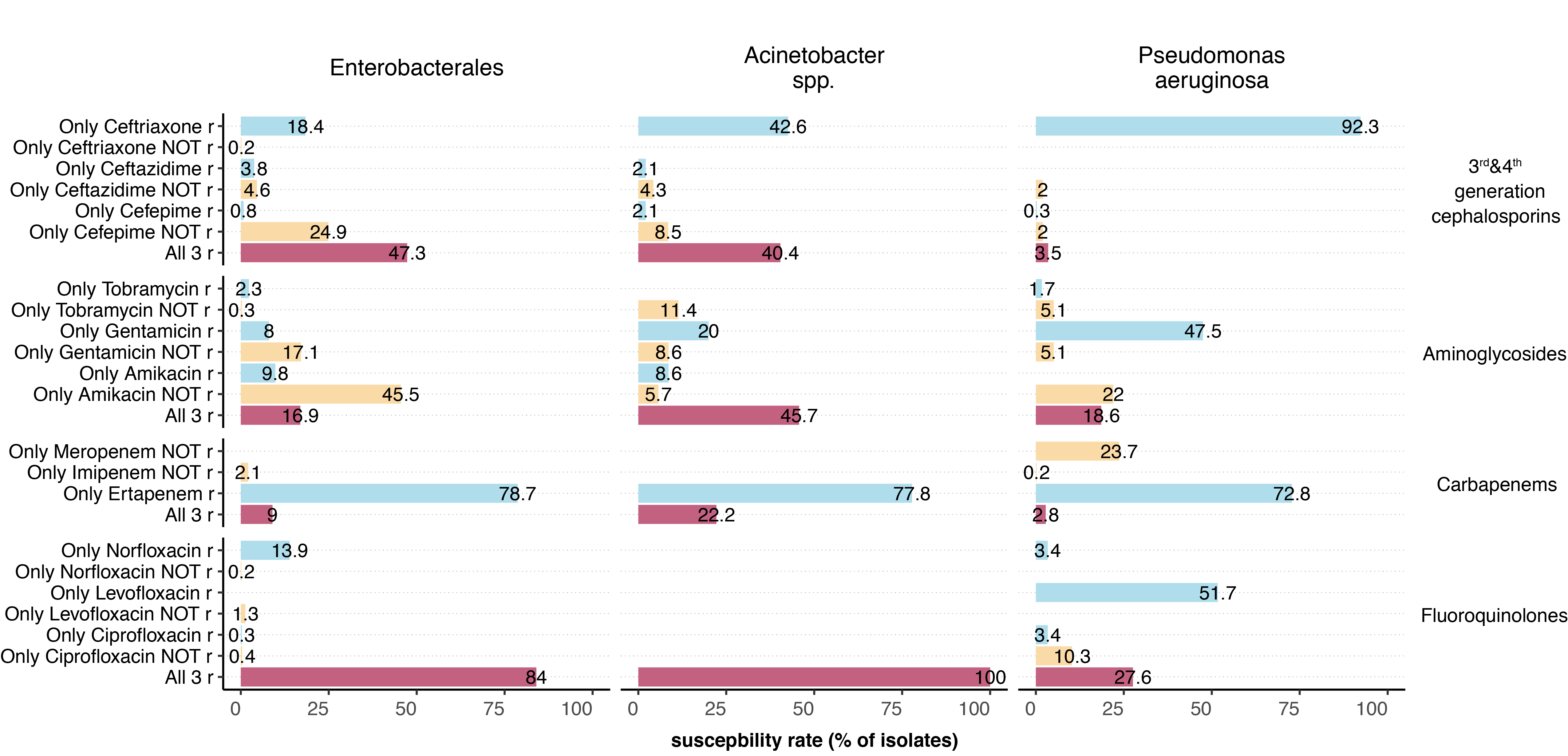 To assess cross-resistance within an antibiotic category, only isolates for which all of the most frequently tested antibiotics of a group were analysed were included in the analysis. For the number of isolates included per antibiotic category, see Table S3. Colour code indicates how many antibiotics of the antibiotic category the isolates are resistant (blue, 1 out of 3; orange, 2 out of 3, red, 3 out of 3). r, resistant.