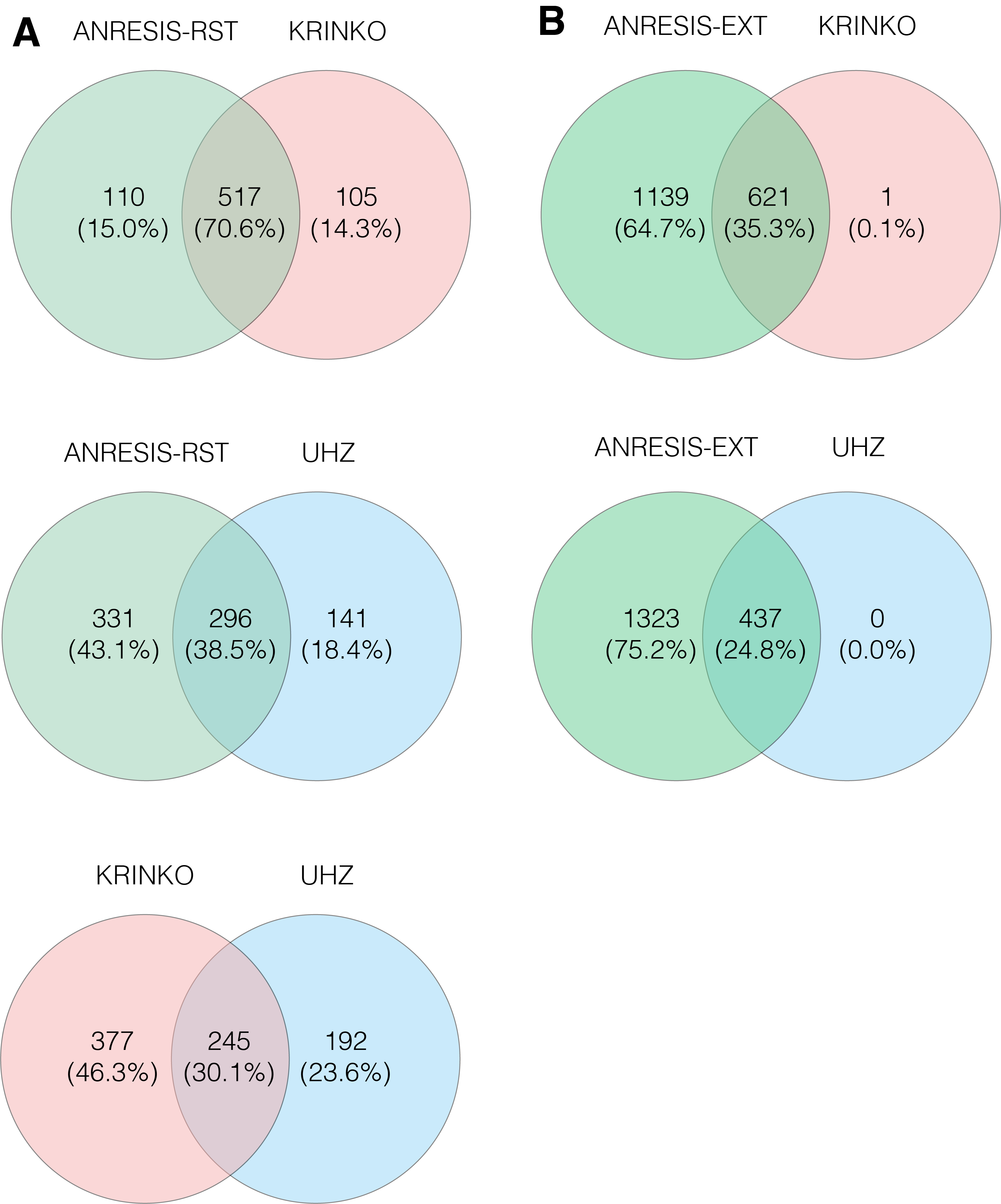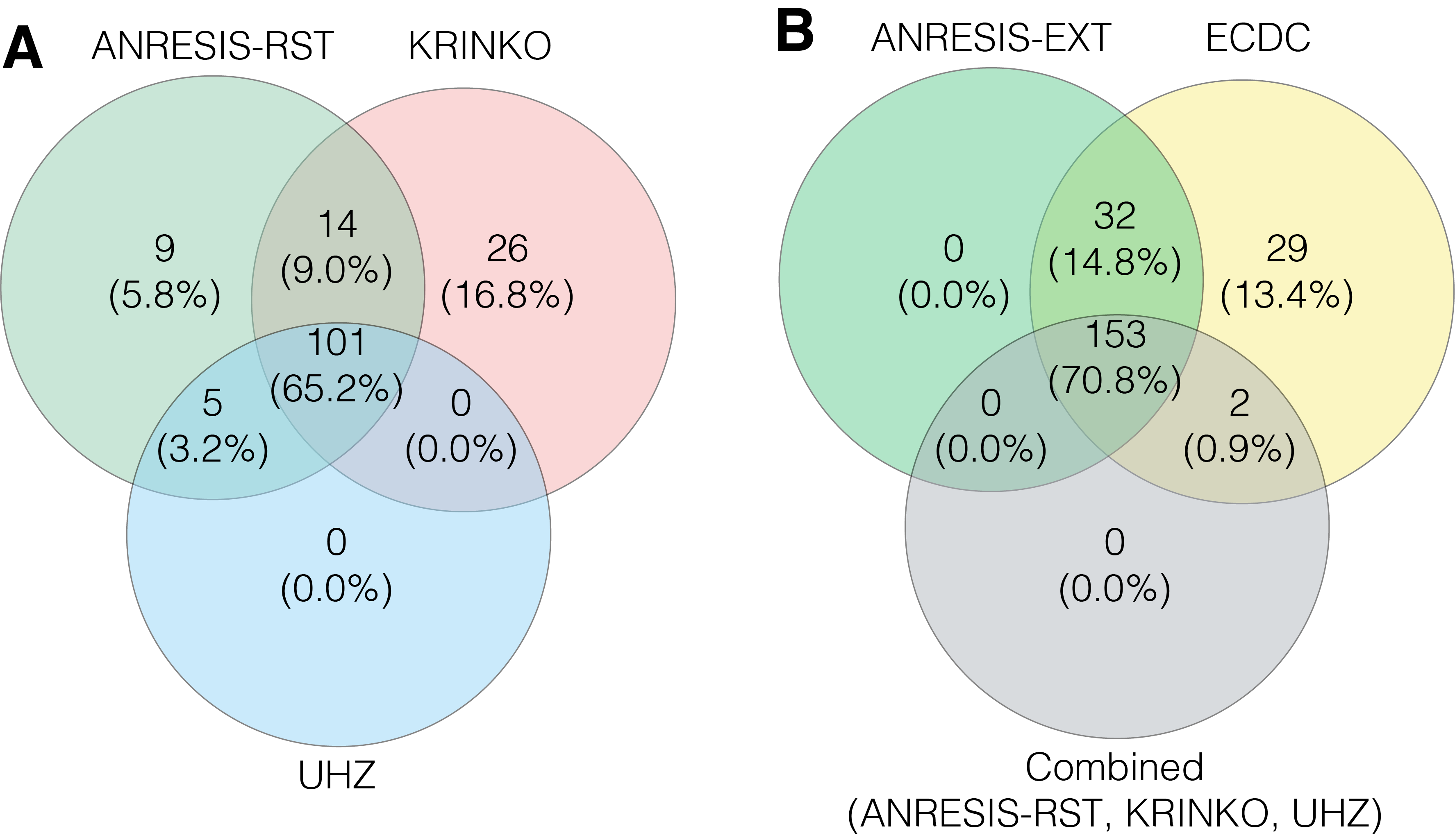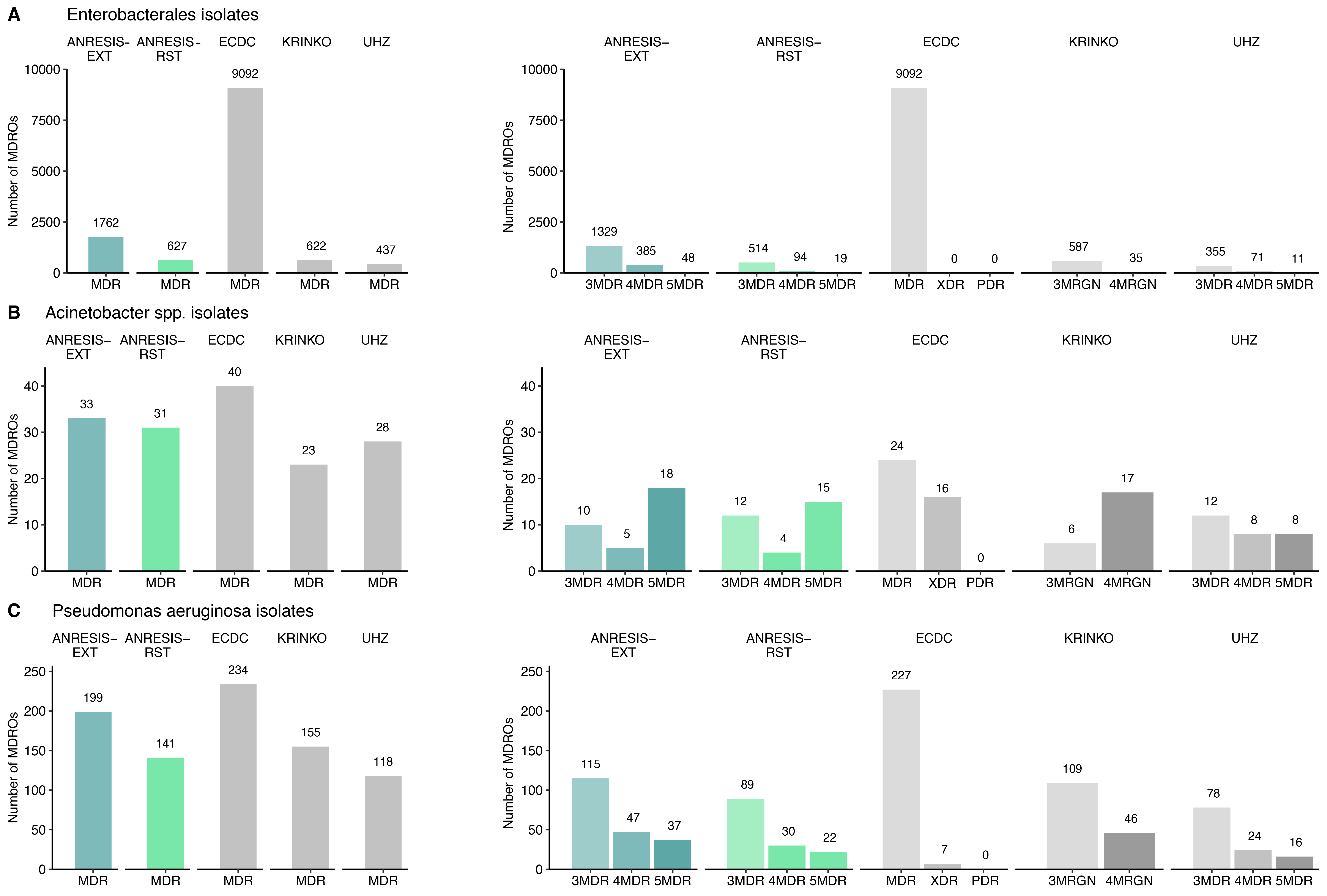 Figure 4 A) Overlap in the number of Enterobacterales isolates classified as MDR following the application of the KRINKO, UHZ and ANRESIS-RST definitions.
