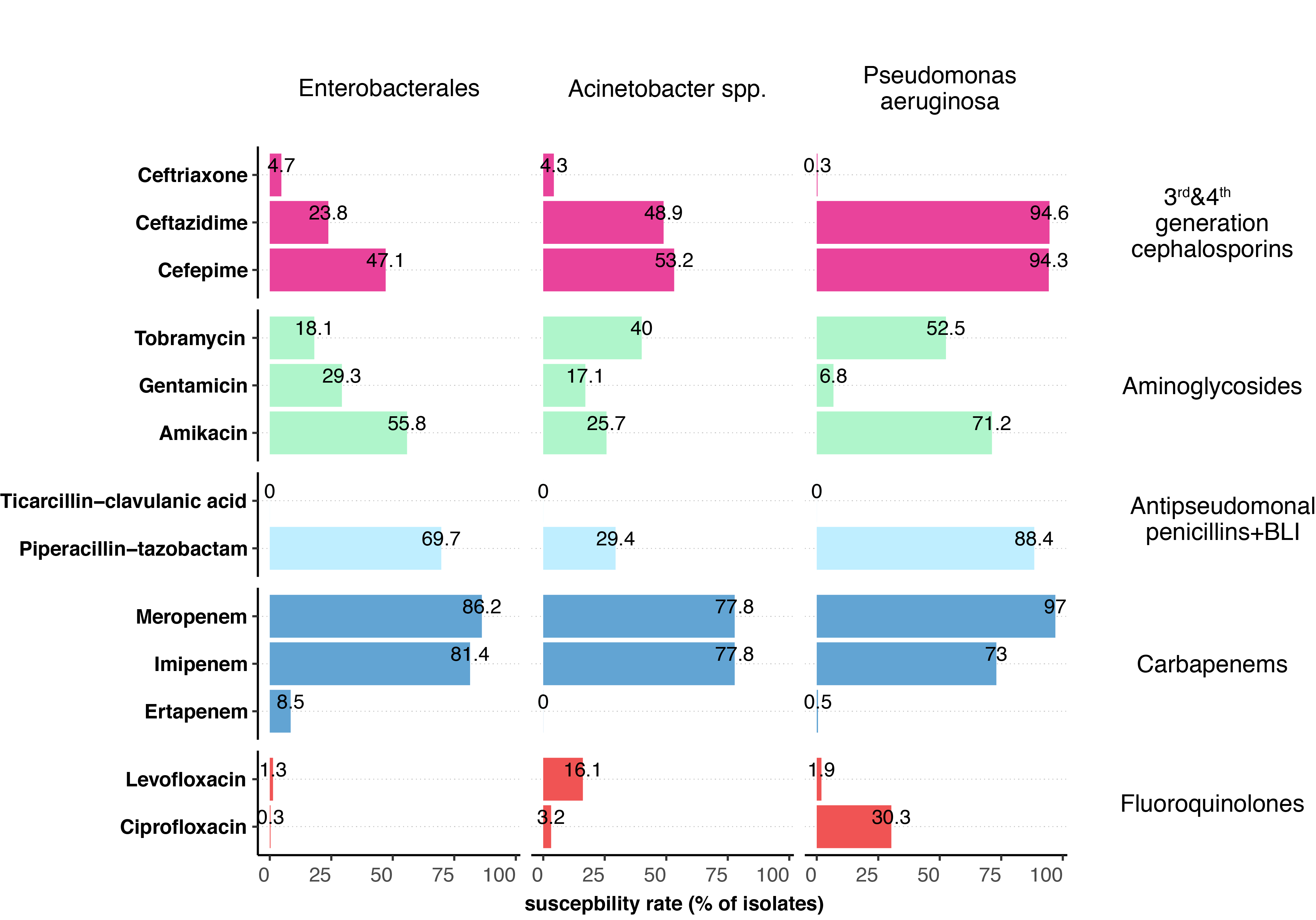 | Third- and fourth- generation cephalosporins | Cefepime | 96.1 | 94.7 | 96.3 | 96.6 | 49.9 | 97.1 |