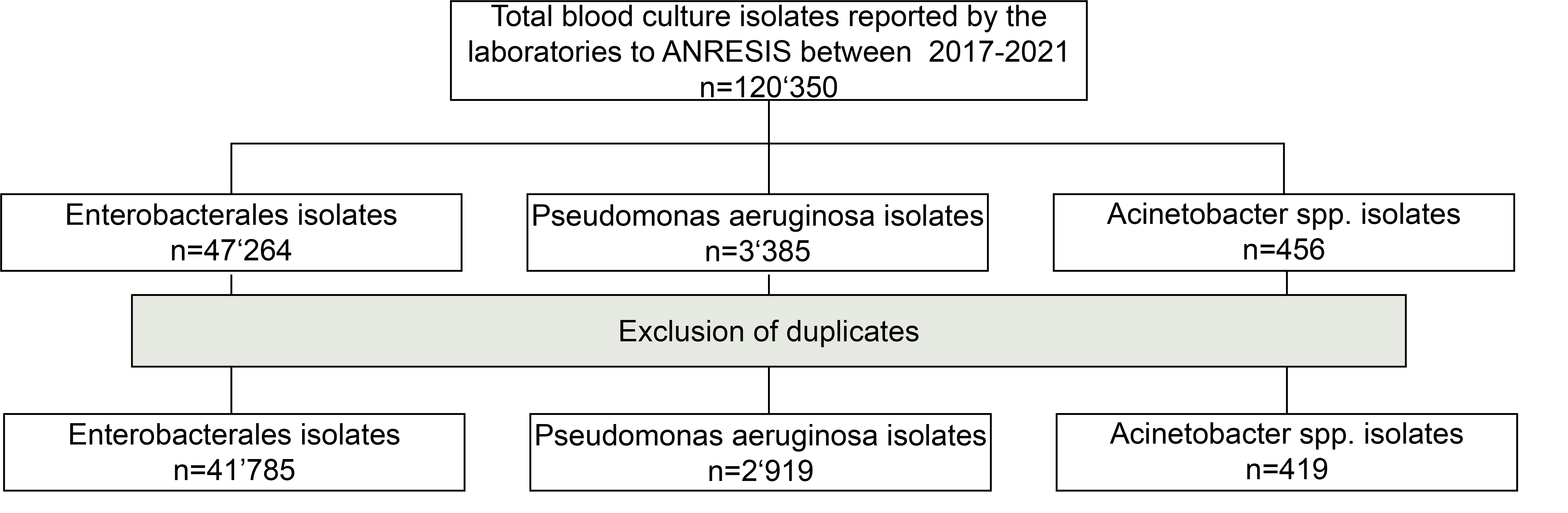 From January 2017 to December 2021, the AST results of 47,264 Enterobacterales, 3,385 , and 456 spp. blood culture isolates were available in the ANRESIS database. After the removal of duplicates, 41,785, 2,919 and 419 isolates, respectively, were used for further analysis.