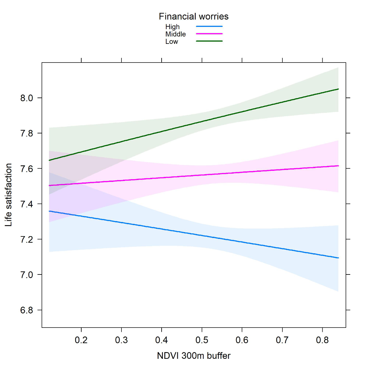 This NDVI effect in the high household income group corresponds to a life satisfaction increase by 0.2 points for NDVI increase from 1st to 3rd quartile. NDVI was negatively associated with life satisfaction in the most financially worried, while positively associated with life satisfaction in the least financially worried (figure 5 and table 4). When NDVI increased from 1st to 3rd quartile, life satisfaction increased by 0.08 in the least financially worried, while it decreased by 0.06 in the most financially worried.