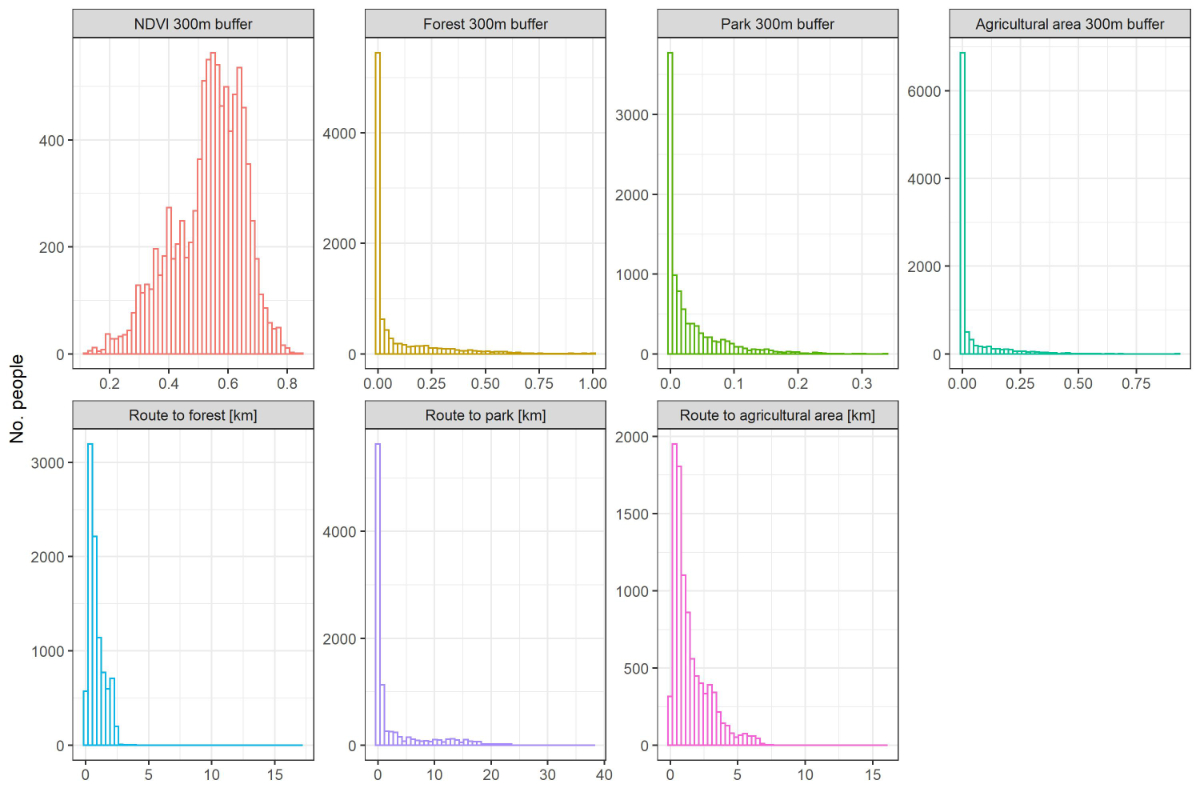 As a better indicator of proximity to greenspace, we computed shortest route considering the road network, rather than Euclidian distance. Shortest route to either forest, urban parks, or agricultural area was computed for each participant’s home address, based on the road network data from SwissTLM Regio (https://www.swisstopo.admin.ch/de/geodata/landscape/tlmregio.html).