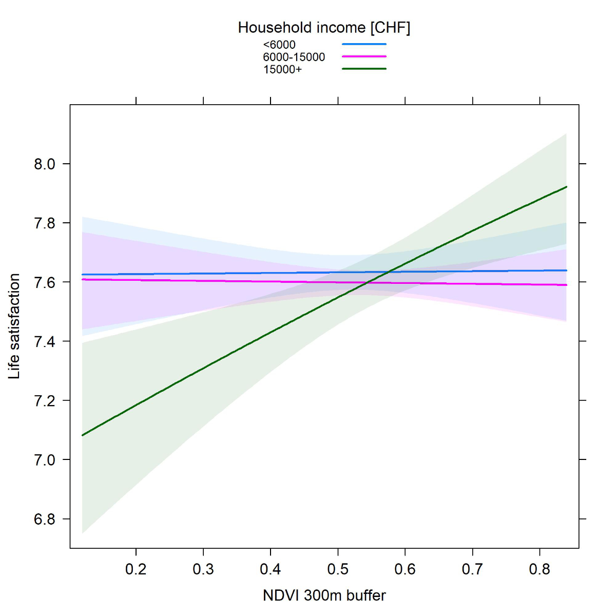 Table 3Moderation by household income (likelihood ratio test p-value = 0.0049). Results from Beta regression of life satisfaction on NDVI by household income, adjusted for life satisfaction in the past, age categories, sex, financial worries, canton, degree of urbanisation, and month of entry.