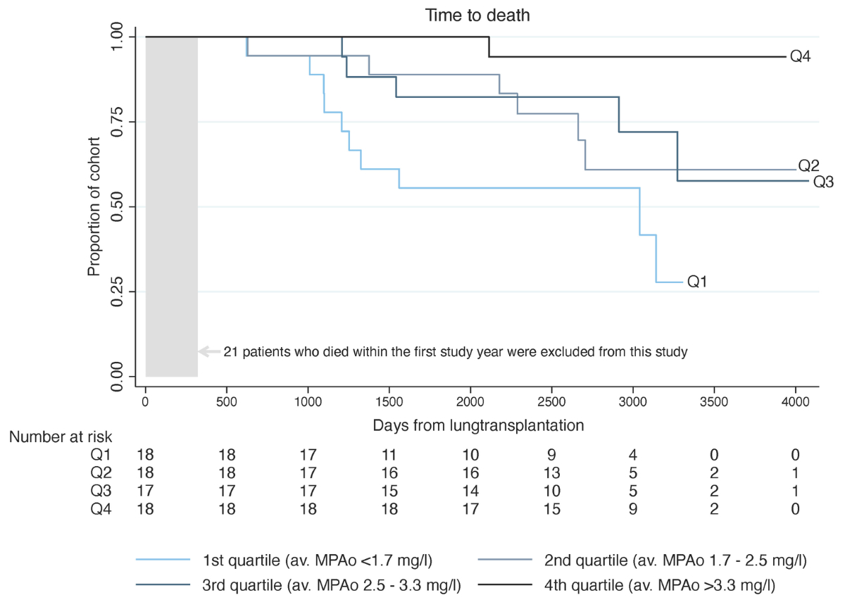 One of the limitations of the study is that in about 80% of the cases, no MPA0 measurements were performed on the days on which an event (death, chronic lung allograft dysfunction) took place. In these cases, we considered the last MPA0 measurement before the event in the model, as all patients have regular check-ups (a sensitivity analysis with the next measurement did not yield any different results). Furthermore, the study did not analyse any other immunosuppressant for the development of chronic lung allograft dysfunction, and only focused on the influence of mycophenolate mofetil. Since mycophenolate mofetil is only one component of the triple immunosuppressive therapy, our findings indicate that the net effect of mycophenolate mofetil alone is not of any significance for the onset of chronic lung allograft dysfunction. We suspect that chronic lung allograft dysfunction development is rather influenced by one of the other two components of the immunosuppressive therapy or by the overall effect of the triple immunosuppression. Gallagher et al. found that tacrolimus levels between 6 and 12 months after a lung transplant affected the development of chronic lung allograft dysfunction [1, 27]. Moreover, only cases of bilateral lung transplantation were included in the analysis. Our cohort also included re-transplantation (n = 3), in which the initial transplantation was performed before the start of observation in 2010. Another limitation is that antibody-mediated rejection and its relationship to mycophenolate mofetil dosage and MPA0 were not investigated because they occur relatively rarely. Ultimately, the exclusion of 21 patients with a post-transplant survival of less than one year and of another 56 patients who did not provide general consent limited the study result and resulted in a smaller sample size, and due to the nature of our single-centre study we did not perform a sample size calculation.