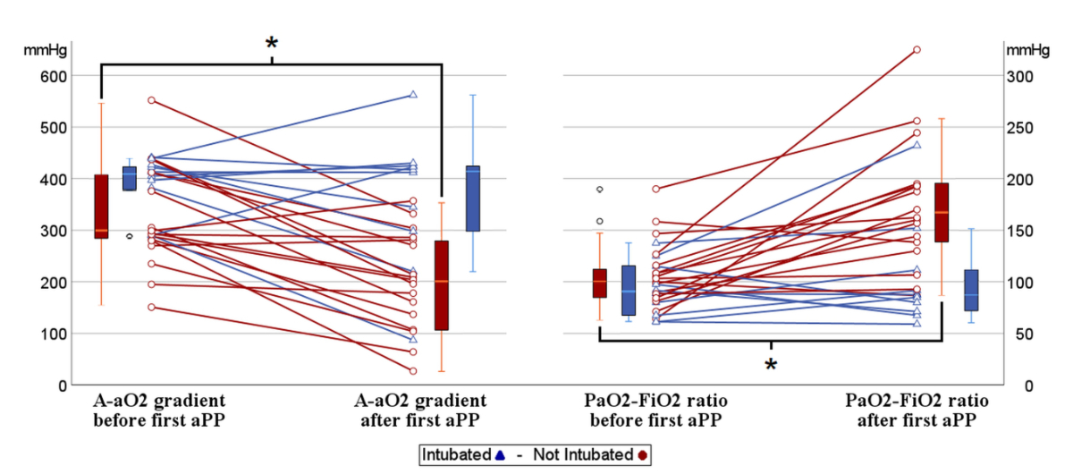 Figure 1 Individual changes in Aa-O2 and PaO2/FiO2 before and after the first aPP for patients who were ultimately intubated (in blue) or not (in red).
