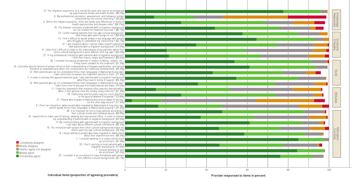 | Positive items | 62.9% (item 19) | “I would like to make use of training, advising and educational offers, in order to improve my understanding of patients with a migration background.” |