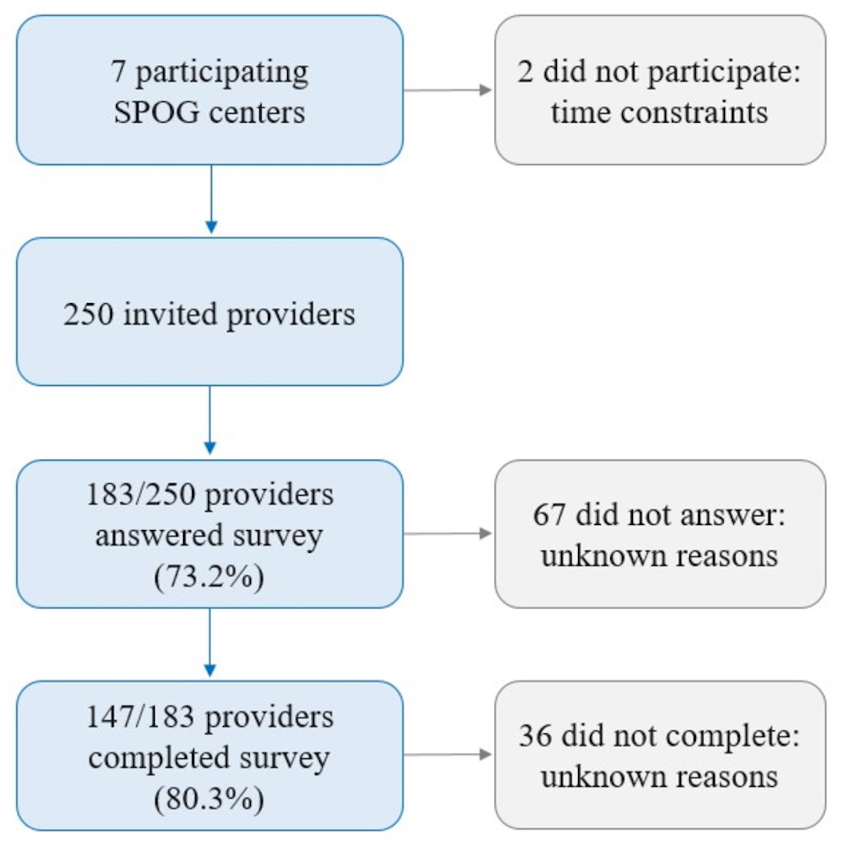 Seven of nine SPOG stations agreed to participate: four (out of six) from the German-speaking language region, two (out of two) from the French-speaking language region, one (out of one) from the Italian-speaking language region of Switzerland. The remaining two SPOG stations from the German-speaking language region did not participate owing to time constraints. In total, we invited 250 paediatric oncology care providers to complete the survey. The response rate was 73.2% (n = 183/250). The completion rate was 80.3% (147/183), which means that almost one in five providers did not complete the entire survey, resulting in missing values (fig. 1). It has to be noted that missing data can vary across items. We did not account for missing data.