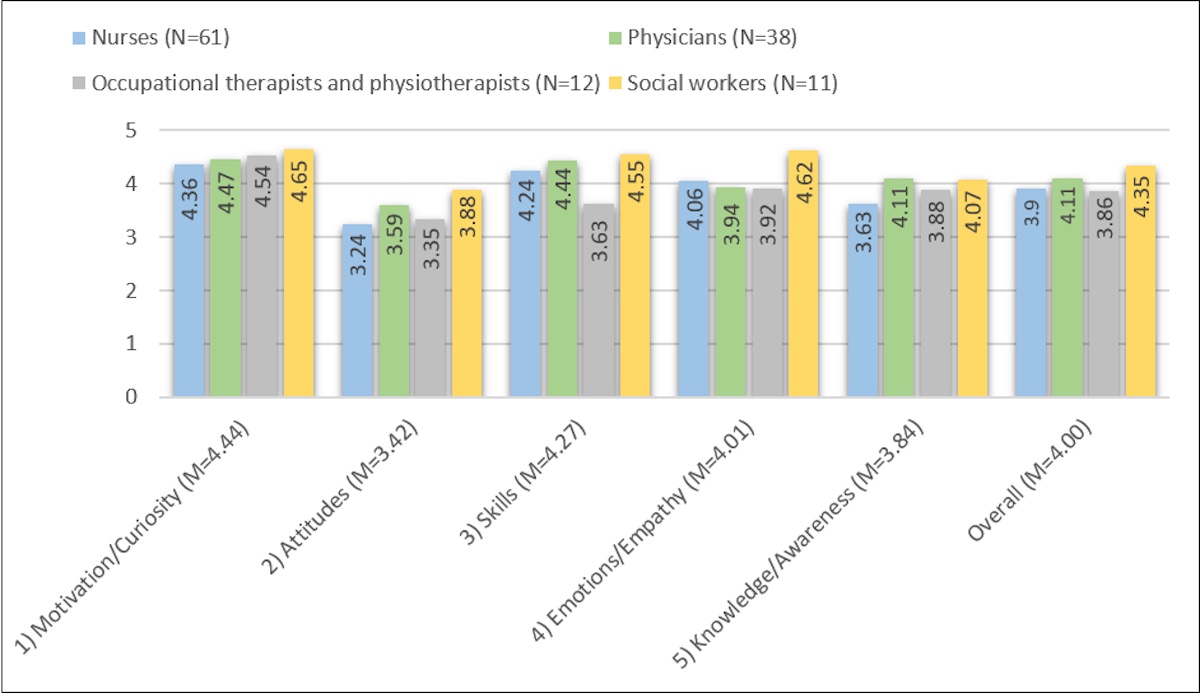 Overall: physicians (p = 0.017) and social workers (p = 0.000) had higher cross-cultural competence scores than nurses; social workers had higher scores than occupational therapists and physiotherapists (p = 0.003). Attitudes: both physicians (p = 0.035) and social workers (p = 0.011) had significantly higher scores than nurses. Skills: occupational therapists and physiotherapists had significantly lower scores than all three other groups, namely nurses (p = 0.001), physicians (p = 0.000), social workers (p = 0.000). Emotions/empathy: social workers had significantly higher scores than all three other groups, namely nurses (p = 0.020), physicians (p = 0.004), occupational therapists and physiotherapists (p = 0.023). Knowledge/awareness: physicians had significantly higher scores than nurses (p = 0.005).