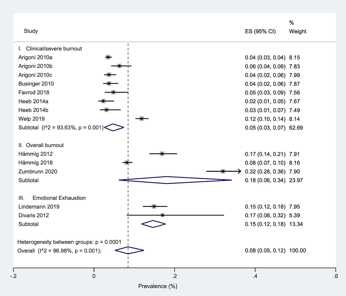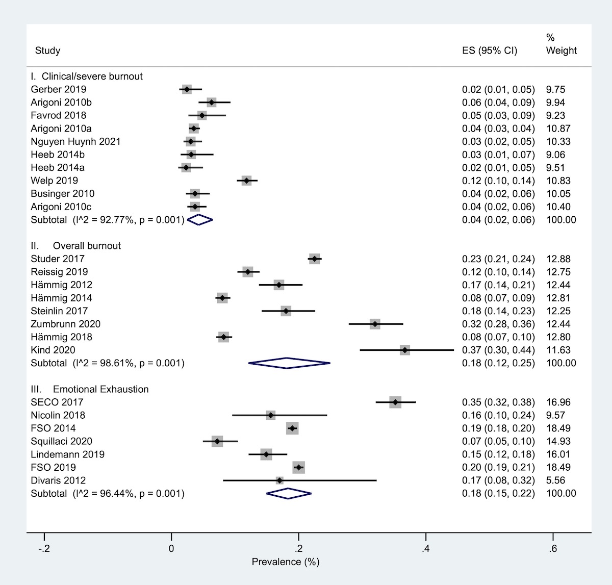 The sample size of included studies ranged from 36 to 11318 Swiss workers with a median of 523. The female workers ranged from 18% to 93.7%. Eight different measures were used to assess burnout prevalence among the participants in the primary studies: nine used Maslach Burnout Inventory (MBI), five used Copenhagen Burnout Inventory (CBI), three used Emotional exhaustion (EE), two used the Burnout Screening Scale (BOSS), one each used the medical diagnosis, Shirom-Melamed Burnout Measure (SMBM), Physician Well-Being Index (PWBI), and a single-item scale. Ten studies reported on physicians, residents, dentists, medical students, nurses, midwives, medical managers and hospital employees while the remaining studies were conducted on other subpopulations such as education and social workers (4 studies), industrial workers, farmers, or the general population.