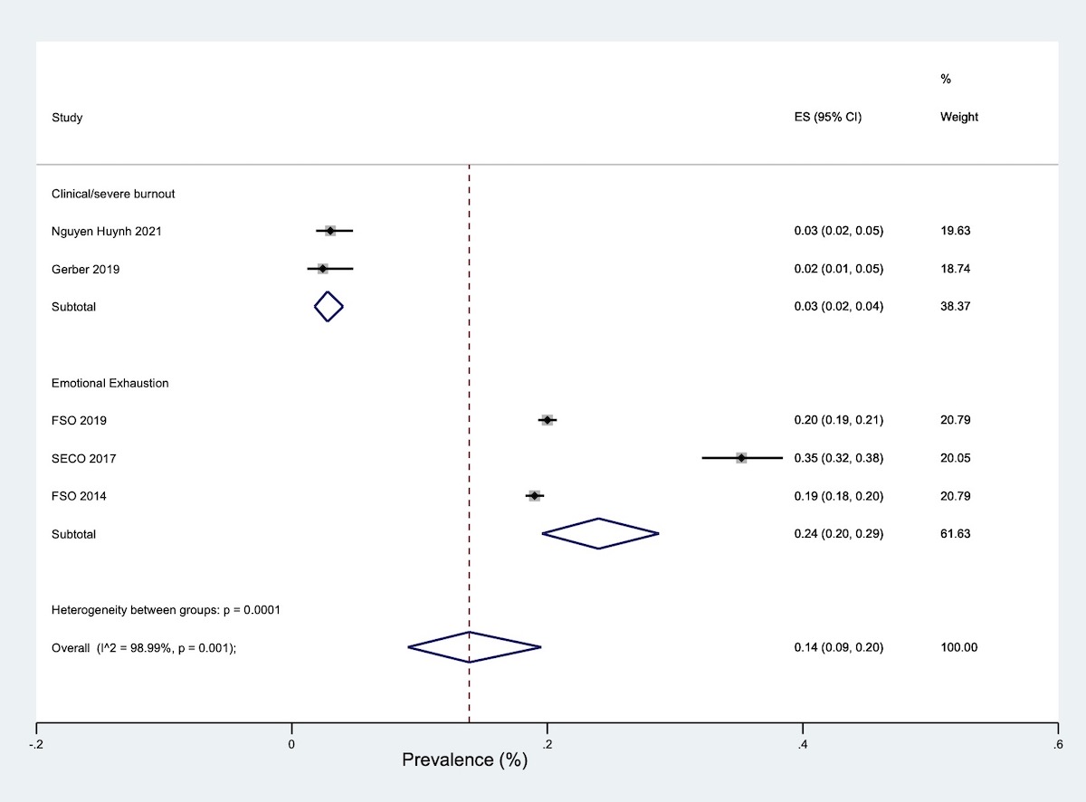 This study aimed to estimate the prevalence of occupational burnout in the Swiss population and searched for primary studies that were published in 2010 and later. We identified 23 studies that assessed the prevalence of burnout among workers in Switzerland. Regardless of occupation, our meta-analysis estimated a prevalence of clinical/severe burnout of 4% and overall burnout or emotional exhaustion prevalences were of 18%. Interestingly, the prevalence of emotional exhaustion was assessed at 20% between 2012 and 2017 in a large representative study of Swiss workers [19]. Although emotional exhaustion is a core dimension of burnout, our results suggest that this dimension is not sufficient to constitute burnout. This is consistent with the harmonised definition of occupational burnout [3]. Therefore, the estimates of emotional exhaustion overestimate the prevalence of clinical burnout. Indeed, clinical/severe burnout estimation of 4% seems robust enough and equates to the proportion of burnout cases that were diagnosed in clinical practice in the cantonal polyclinics in Western Switzerland [45].