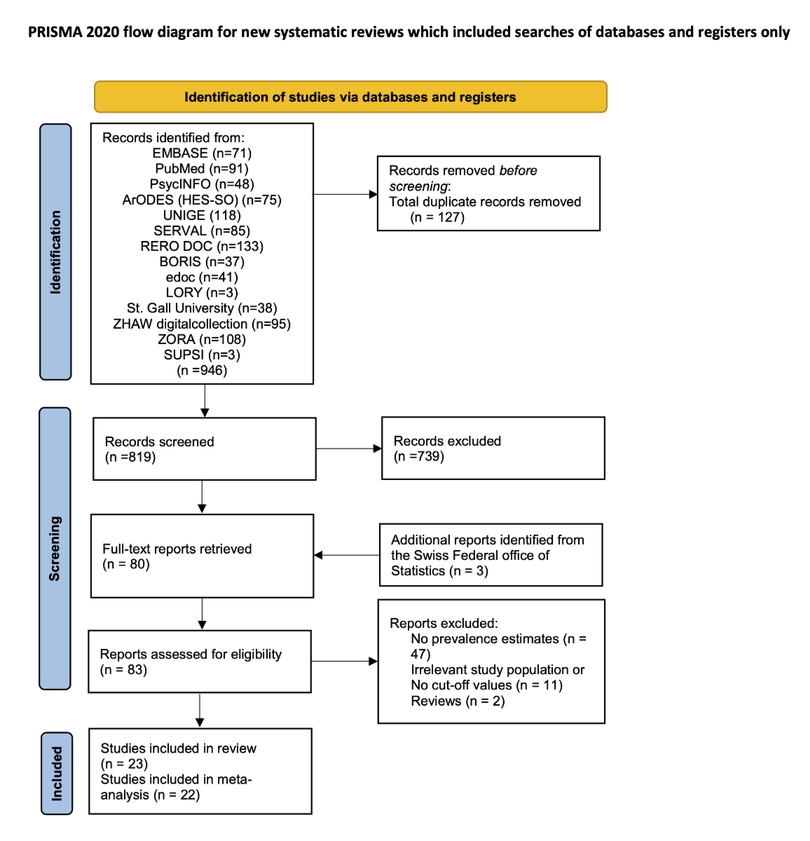 We designed a systematic search strategy and interrogated the following databases: Medline (PubMed), EMBASE, PsycINFO, and Swiss university databases: ArODES (HES-SO), SERVAL, RERO DOC, BORIS, edoc, LORY, Université St. Gall, ZHAW digital collection, ZORA and SUPSI (see abbreviations in fig. 1). In PubMed, for instance, the search strategy comprised Medical Subject Heading Terms (MeSH) (e.g., "burnout, professional" [Mesh]), free text words (e.g., "emotional exhaust" [tiab]), Boolean terms (e.g., AND, OR) and truncations (e.g., work*) where necessary. In EMBASE, we used EMTREE terms, free text words, Boolean terms, proximity operators (e.g., near/n), and truncations where necessary (see appendix). Besides electronic searches, we manually searched references lists of identified studies, and used the google search engine as well as the Google scholar platform to identify additional eligible studies. We focused our search strategy on the period 2010–2021 in order to consider the most recent, but sufficiently numerous and methodologically robust, studies for providing useful and relevant estimates of the current prevalence of occupational burnout. As the first estimates related to occupational burnout (namely emotional exhaustion) in the general Swiss population have been reported only since 2012 [19], we interrogated the databases from January 2010 to 6 July 2021.
