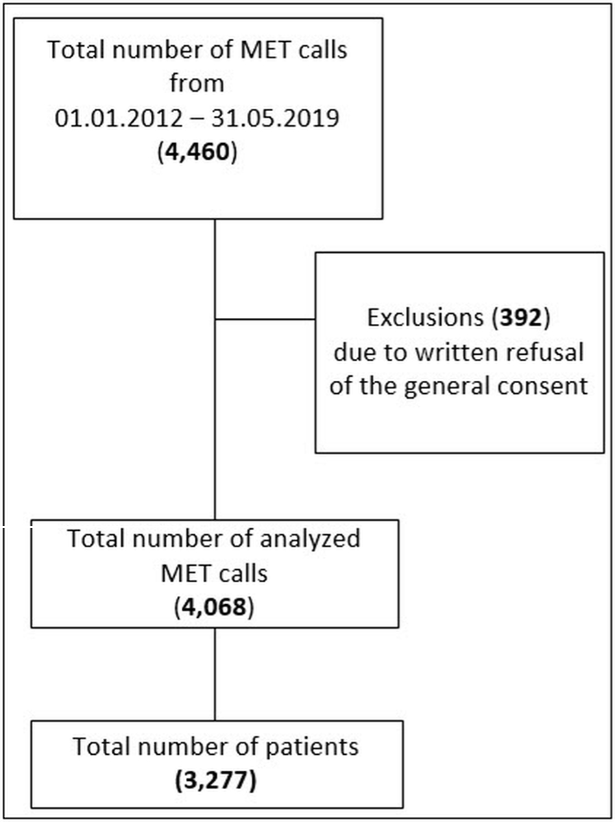 In this study, we analysed data collected on all MET calls between first of January 2012 until the 31st of May 2019. Some data have previously been published in an analysis by our institution, which reviewed process parameter to establish the prognostic significance of antecedents of MET calls on patient outcomes in the context of MET calls and was performed between 2009 and 2013 [1]. The study was approved by the Ethical Committee on human research of the Canton of Bern (EC approval no.: 2019-01260) and adheres to the tenets of the Declaration of Helsinki. Patient consent was waived by the Ethical Committee, however we excluded all patients with documented written refusal of the general consent. Study reporting complies with the “STrengthening the Reporting of OBservational studies in Epidemiology (STROBE)” guidelines [18].