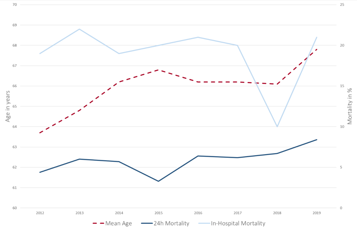 From 1 January 2012 to 31 May 2019, a total number of 4459 MET calls were documented, involving 3627 patients. After excluding patients with documented written refusal, a total of 4068 calls involving 3277 patients remained in the final analysis set (see fig. 1), of whom 37% were female (n = 1210). The mean age was 65.9 (±15.7 years. Mean age increased over time (see fig. 4). About one in ten patients requiring a MET call was initially hospitalised in the ICU (n = 366 patients, 9.1%), whereof 180 were re-admitted to the ICU via MET. A total of 581 patients (17.7%) had more than one MET call (range 2–7) and in 24 patients, the MET calls occurred during the same hospitalisation. Median time between those MET calls was 119.4 hours (IQR 48.5–360.5). Only 0.2% of all calls (9/4068) were repeat MET calls in patients left on the ward who were then admitted to the ICU.