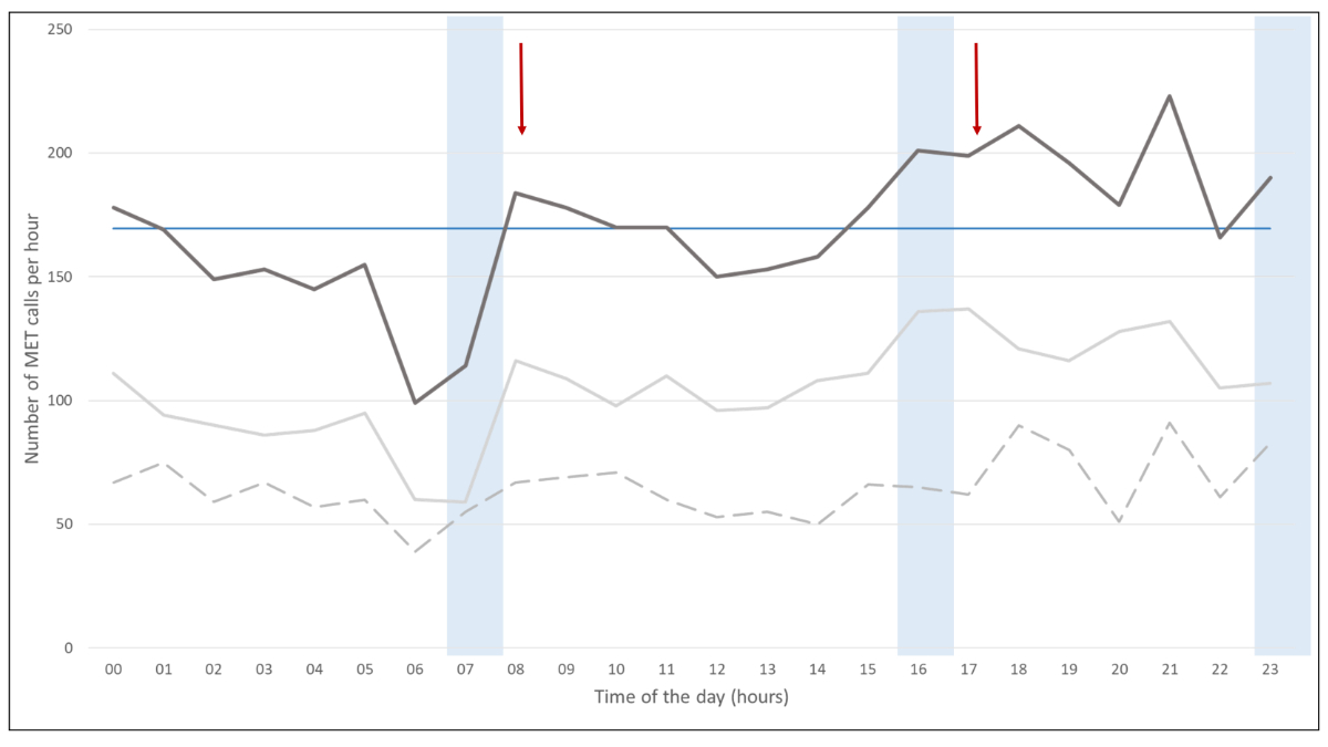 Dark grey line: All MET calls; light grey line: MET calls on medical wards; dotted line: MET calls on surgical wards. Blue shades: half hour before and after nursing shift changes, red arrows indicate beginning and end of doctors’ day shifts (8 am to 5 pm), blue horizontal line: average of calls.