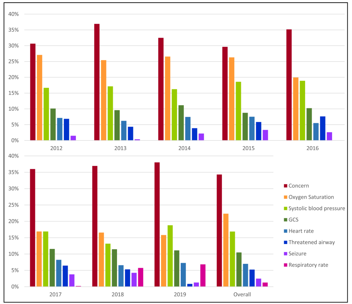 The reason for MET activation was reported for 3473 patients (85.4%). The most common reason was “staff concern” for any reason, in 1192 calls (34%). In 64.8% (n = 760) of those cases, the patient could be managed on the ward, 30.7% were transferred to the ICU, and 52 calls (4.4%) were transferred to IMC. The second most common cause for a MET call was low SpO2 refractory to oxygen therapy, in 776 calls (22%) whereof in 61.6% calls (n = 478) the patients had to be admitted to intensive care. The respiratory rate was reason for 44 (1.3%) of calls. Half of the patients with an abnormal respiratory rate had a rate above 35/min (n = 24, 54.6%), one had a rate <6/min, and the majority had a rate above 22/min (n = 38, 86.4%). The reasons for MET calls remained similar over the years, apart from the respiratory rate, which was first documented in 2017 and was the reason in 6.8% of calls in 2019 (fig. 3).
