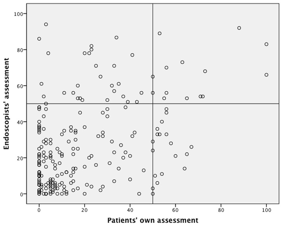 Endoscopists’ and nurses’ estimates of the procedure’s technical difficulty were highly correlated (r = 0.62). When evaluating patient discomfort, the scores of the endoscopists and nurses correlated better with each other (r = 0.58) than with the patients’ self-assessed scores (r = 0.37 and 0.35, respectively). Both endoscopists and nurses tended to overestimate the patients’ discomfort levels, with mean values of 27 mm [SD 2] and 28 mm [SD 2], respectively, on the 100-mm VAS scale. Scatterplots illustrate the lack of correlation between the patients’ own assessments and those of nurses and endoscopists (figures 1A and 1B). According to the arbitrary classification of a good experience corresponding to ≤50 mm and a bad experience corresponding to >50 mm, the endoscopists’ and nurses’ assessments corresponded to the patients’ statements in 79 and 81% of cases, respectively. In general, both endoscopists and nurses tended to overestimate patient discomfort, with a significant overestimation by at least one of them (the endoscopist or the nurse) in 19% (43) of patients. In 14 cases, both the endoscopist and nurse overestimated the level of discomfort for the same patient. Nevertheless, both professional groups underestimated patients’ perceived discomfort in 7% of cases (table 3). Among the 27 (12%) patients who rated their endoscopy experience as bad, only 8 (4%) were correctly identified by both members of the endoscopy team, a further 8 (4%) were correctly identified by at least one member of the team, but 11 (5%) were mis-classified by both (fig. 2).