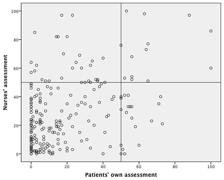 Scatterplots showing the results of patients’ own assessments compared with the assessments of the endoscopists (1A) and nurses (1B).