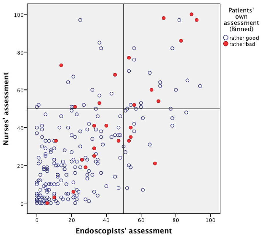 Scatterplots showing the results of endoscopists’ and nurses’ assessments.