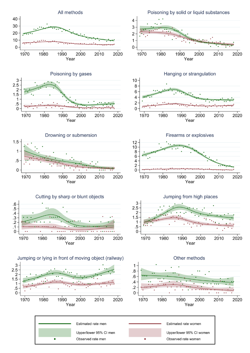 Figure 2 Rates of suicide methods per 100,000 population (person-years) in the age group 10–29 years. Note: estimated true rates and associated confidence intervals (CI) were derived from Poisson regressions using a restricted cubic-spline model.
