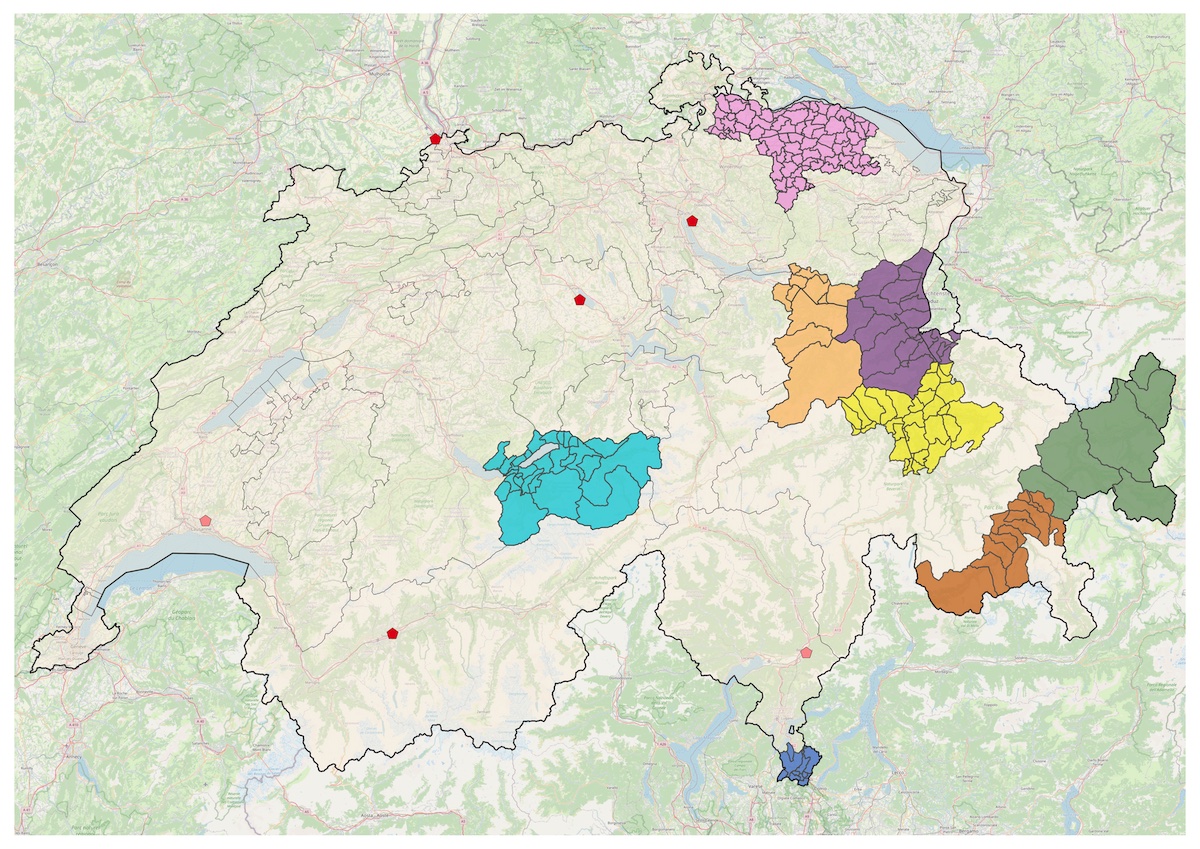 Figure 1 Location of GP practices and specialised service providers for spinal cord injury in Switzerland. Colourful areas depict the participating practices’ catchment areas. Four red pentagons mark the specialised centres for spinal cord injury in Switzerland. Two faded red pentagons mark external ambulatory service units, where patients can receive outpatient services (e.g., annual check-ups) from specialists traveling regularly to these locations. Map data from OpenStreetMap.