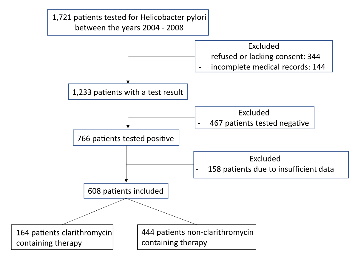 Data of 1721 patients from the department of Gastroenterology and Hepatology were analysed by extensive review of their medical records. A total of 608 patients aged ≥18 years who were treated within our department were included in the final analysis (for details see figure 1). All these patients fulfilled the following criteria: a urea breath test (UBT) between 2004 and 2018 that was positive for H. pylori, and at least one subsequent eradication therapy with eradication confirmed (between 2005 and 2018, at least 4–8 weeks after therapy completion). As can be seen in figure 1, 158 patients were excluded because of insufficient data, meaning they either did not receive an eradication therapy to our knowledge or there were not enough data about the therapy they received, or there was no confirmation of eradication. The urea breath test was preferred for checking eradication due to its high diagnostic sensitivity (96%) and specificity (93%) [10], as well as its convenience. If the first-line treatment was not successful, most patients were treated with a second-line, and some subsequently with a third-line regimen.