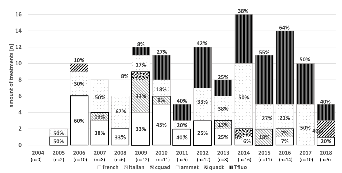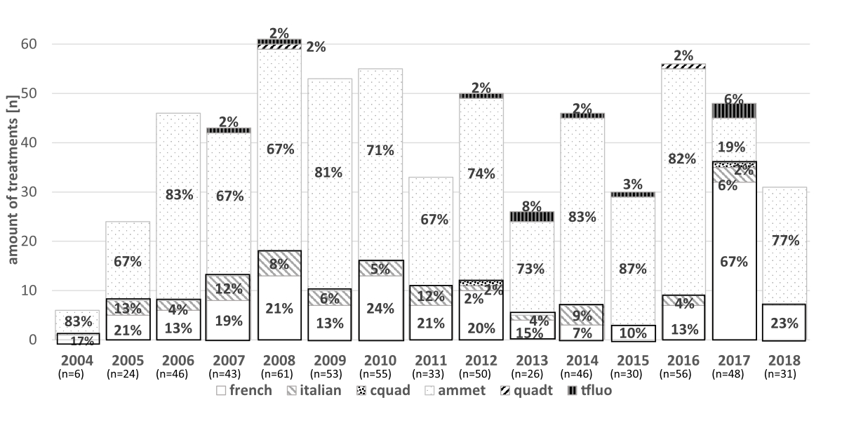 The most common first-line therapy was PPI-amoxicillin-metronidazole in 432 (71%) of all cases during the analysed period between 2004 and 2018, followed by PPI-amoxicillin-clarithromycin in 126 (21%) and PPI-metronidazole-clarithromycin in 36 (6%). The distribution of different first-line therapies for each year is shown in figure 2.