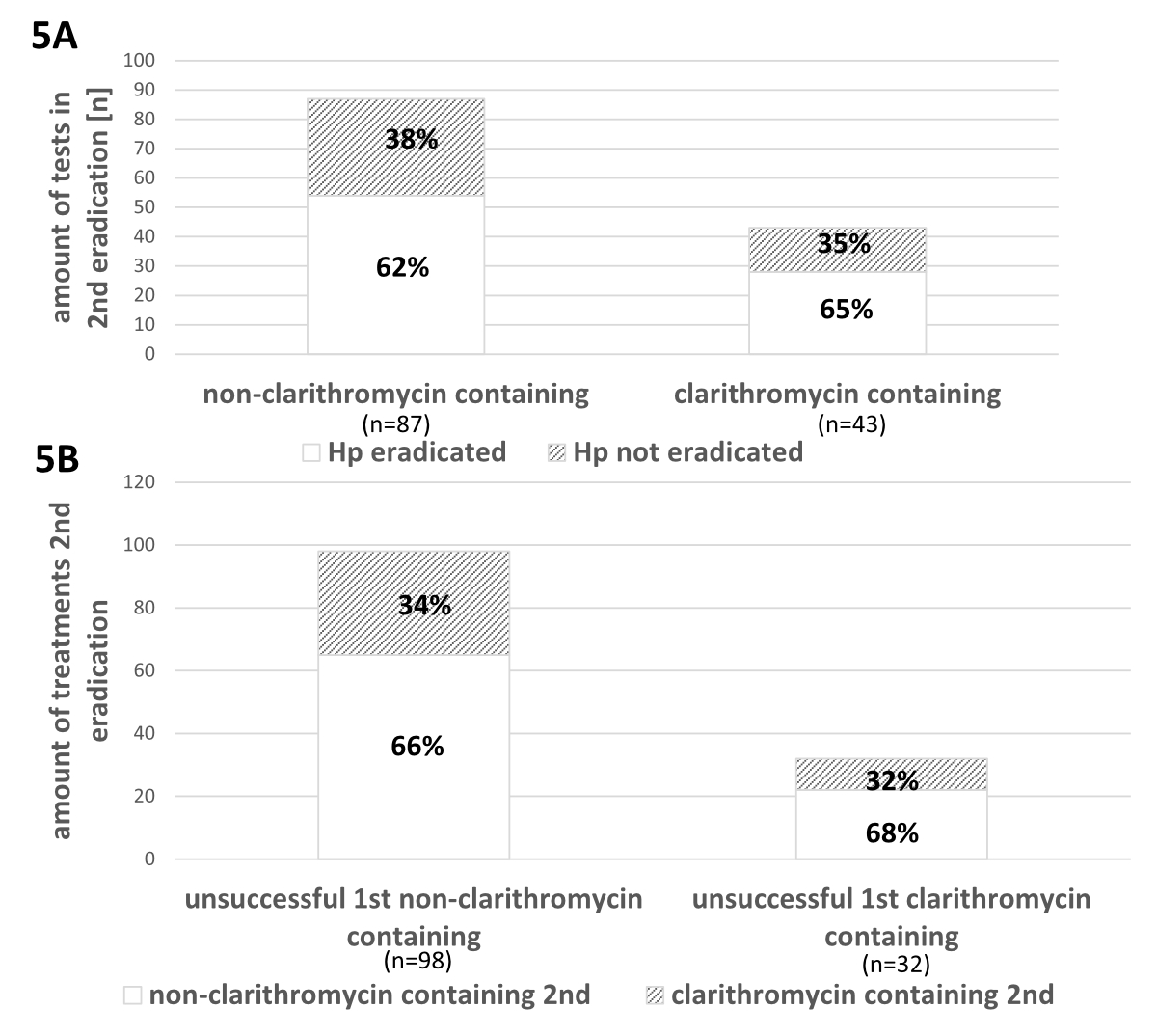 In figure 5B the distribution of second-line therapies containing clarithromycin or not after failed first-line therapy regimens with or without clarithromycin is shown. Their success is shown in the supplementary figure in the appendix.