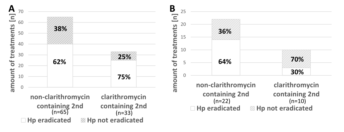 Figure S1 Second-line Helicobacter pylori eradication therapies and their success (between the years 2004 and 2018). A: Different second-line therapies and their successfulness after failed non-clarithromycin containing first-line therapies. B: Different second-line therapies and their successfulness after failed first-line clarithromycin containing therapies.