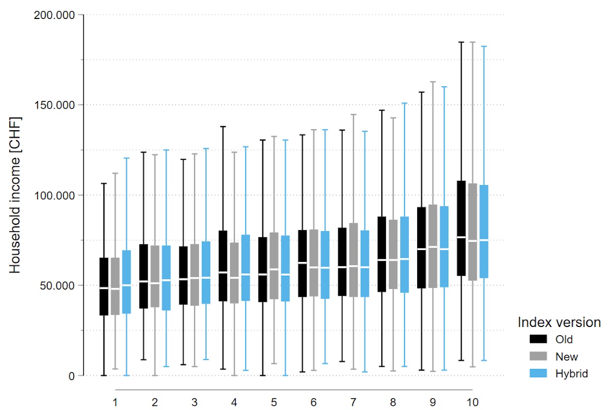 Figure 2 Box plots of the distribution of equivalised yearly household income across the deciles of three indices. Data from 7,193 Swiss Household Panel participants who provided information or had imputed information on the income questions in 2014. Boxplots exclude outliers for better visibility of the central distribution. See online appendix for more details.