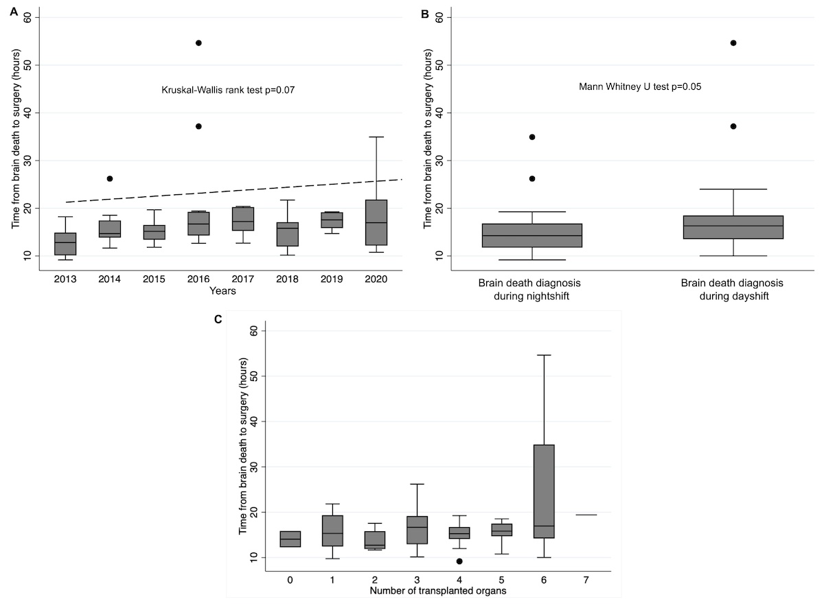 A longer delay till surgery increases the ICU team’s workload and can cause considerable distress for the bereaved families. Moreover, it may lead to the loss of potential organ donors due to hemodynamic instability and cardiac arrest before organ explantation can be achieved. In light of these aspects, further studies are needed to confirm our results and to find ways to reduce this delay.