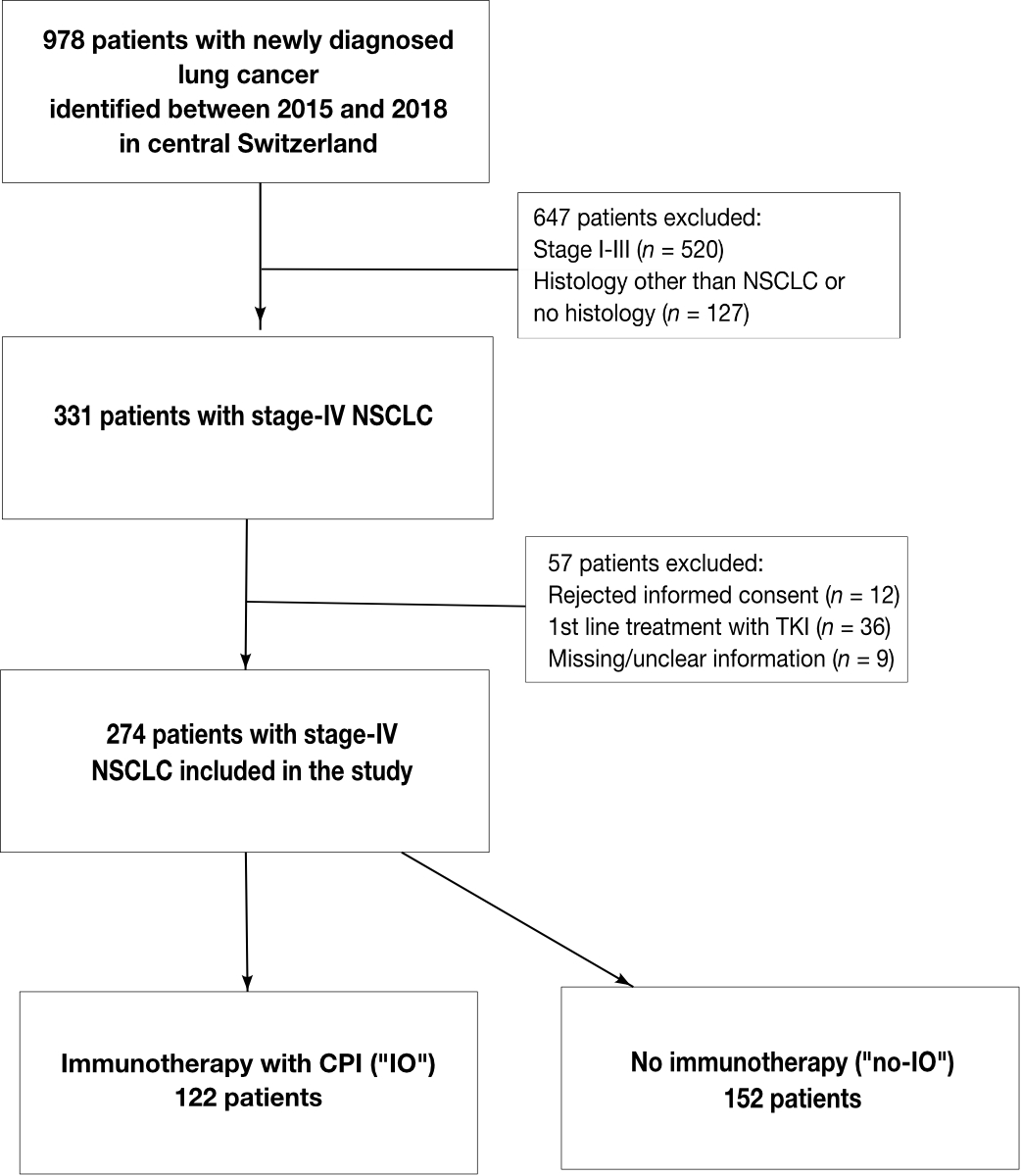 Patient selection and division of patients with metastatic non-small-cell lung cancer (NSCLC) into two groups according to the type of therapy. CPI: checkpoint inhibitor; IO: immuno-oncology; no-IO: no immuno-oncology; NSCLC: non-small-cell lung cancer; TKI: tyrosine kinase inhibitor