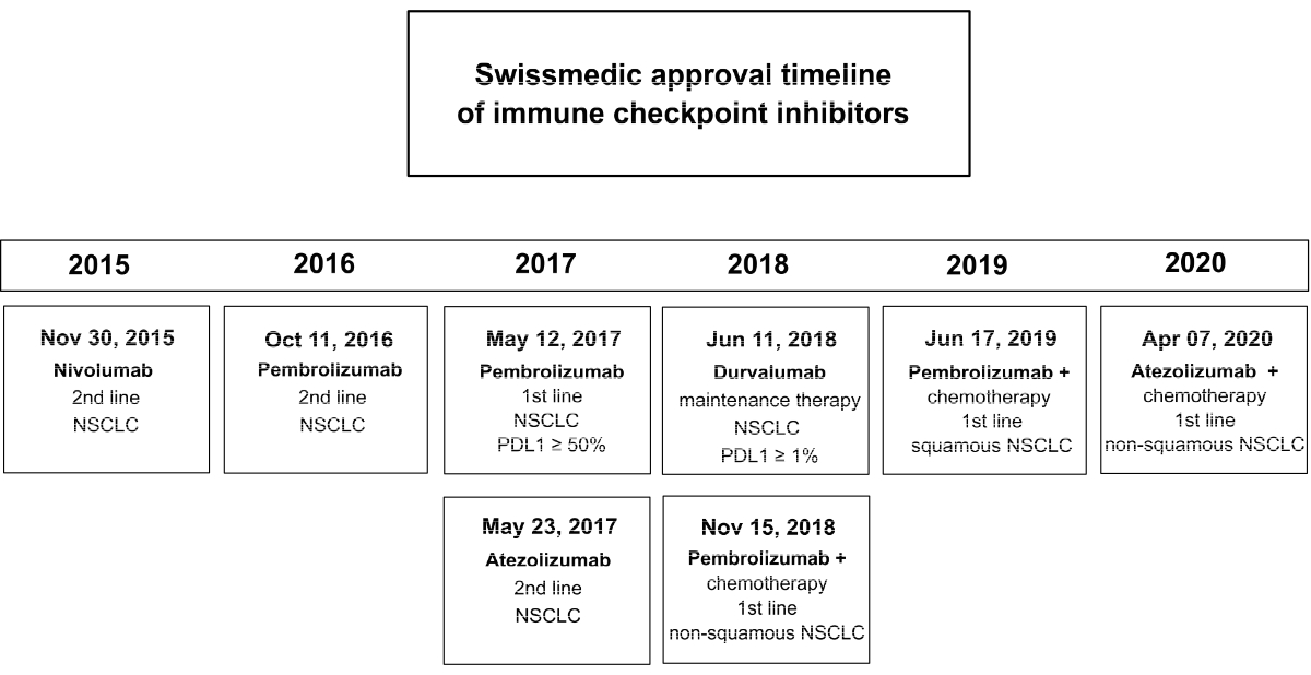 Figure 3 Timeline of approval of checkpoint inhibitors for NSCLC in Switzerland by Swissmedic.