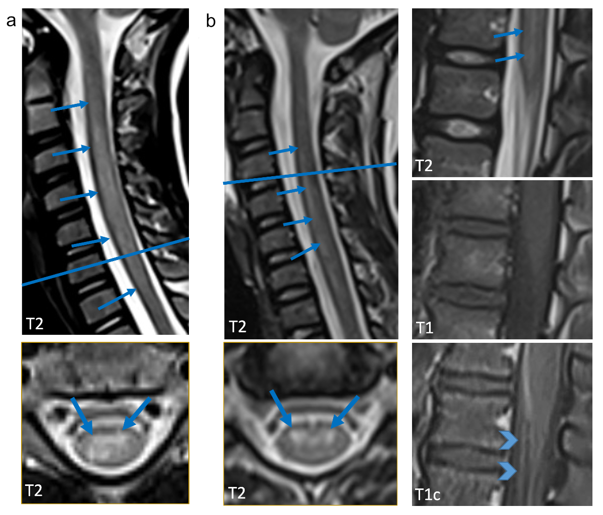 Figure 1 Representative sagittal and axial T2w images are shown (a: patient 1, 9.3-year-old old boy; b: patient 2, 7.1-year-old girl) as well as T1w images with and without contrast agent (b). Cervical myelitis with increased T2 signal is present in both children (arrows), in the boy only in the cervical spinal cord (a), in the girl additionally in the lumbar spinal cord (b). On the axial slice predominant involvement of the grey matter is evident (arrows point to anterior horns). In b (second column) sagittal T1w images show enhancement of the cauda equina and anterior nerve root enhancement (arrow heads).Representative sagittal and axial T2w images are shown (a: patient 1, 9.3-year-old old boy; b: patient 2, 7.1-year-old girl) as well as T1w images with and without contrast agent (b). Cervical myelitis with increased T2 signal is present in both children (arrows), in the boy only in the cervical spinal cord (a), in the girl additionally in the lumbar spinal cord (b). On the axial slice predominant involvement of the grey matter is evident (arrows point to anterior horns). In b (second column) sagittal T1w images show enhancement of the cauda equina and anterior nerve root enhancement (arrow heads).