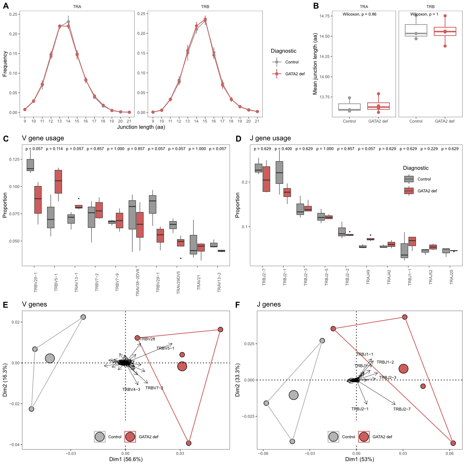 Figure 1 Comparison of TCR repertoire characteristics in GATA2 patients and healthy controls. (A) CDR3 junction length (amino acids) distributions in both clonal chains. (B) Comparison of mean CDR3 junction length. (C) Comparison of V gene and (D) J gene usage. Shown are the ten most frequently used genes respectively. Pairwise comparisons performed using the Wilcoxon test. Group size: GATA2 def = 4, Control = 3. (E) Principal component analysis by diagnosis including usage of all V genes and (F) J genes. Areas are the convex hulls of the diagnostic group and the largest point of one colour represents the centre of that hull. Arrows show contributions of individual input variables, only strongest contributors are labelled.